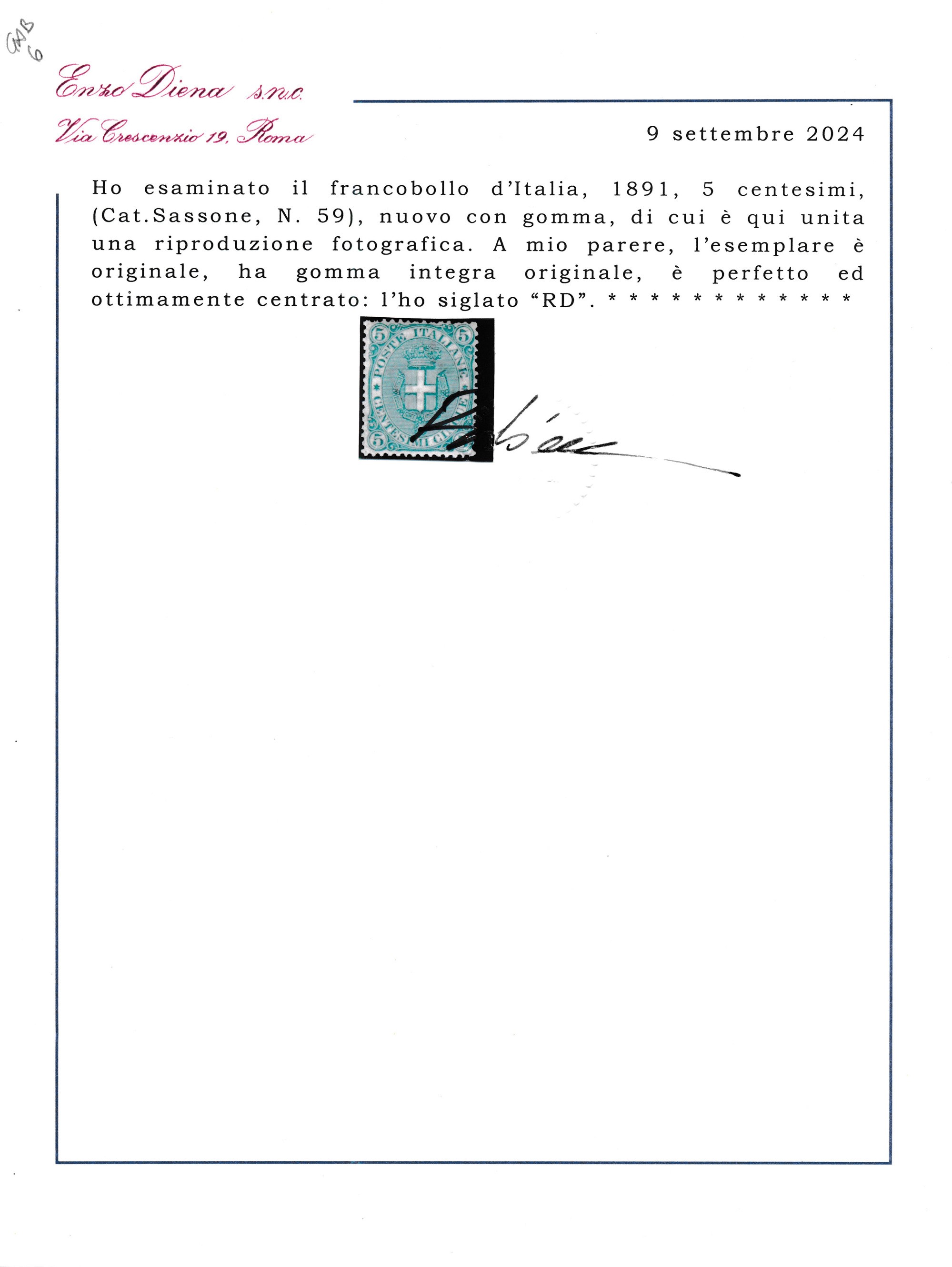 1891 – Regno d’Italia – 5 cent. verde “Scudo Savoia”, gomma integra (Sass. 59).