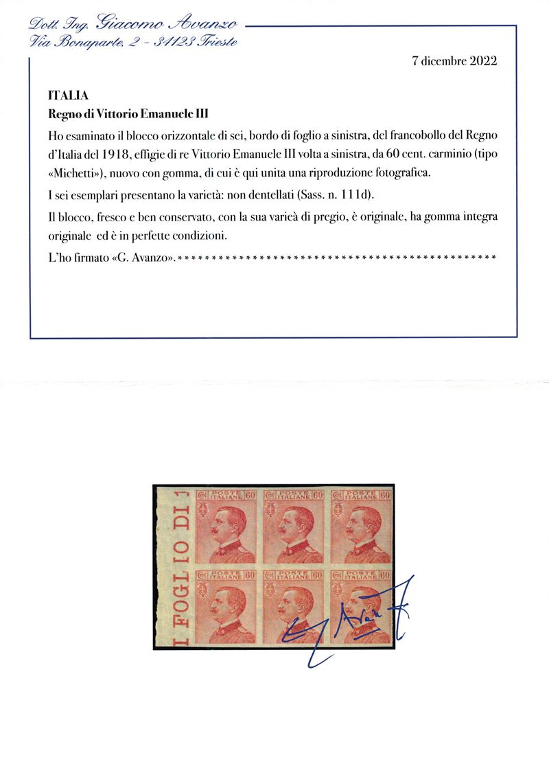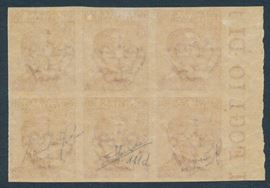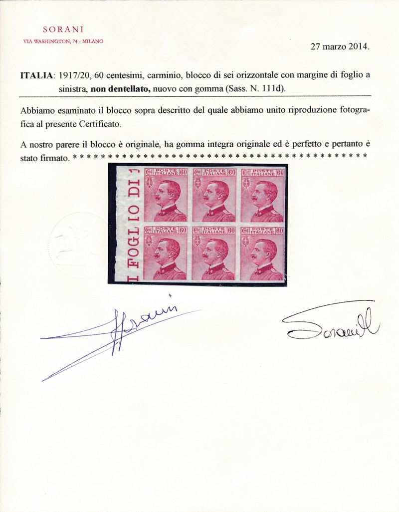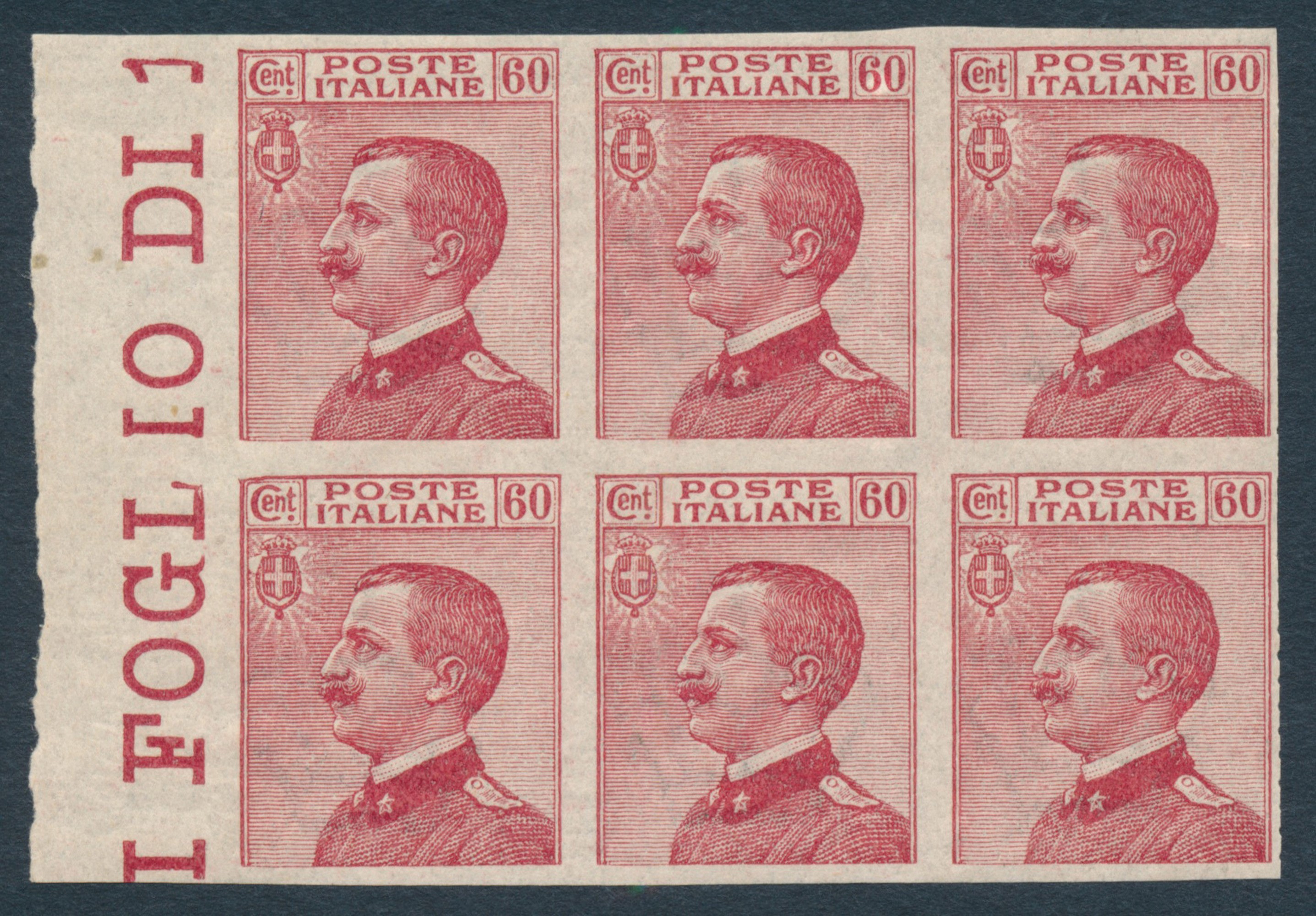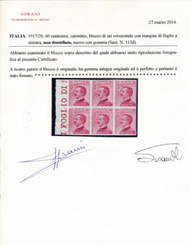 1917/20 - Regno d’Italia - 60 cent. carminio - Blocco di sei esemplari bdf non dentellati (Sass. 111d).