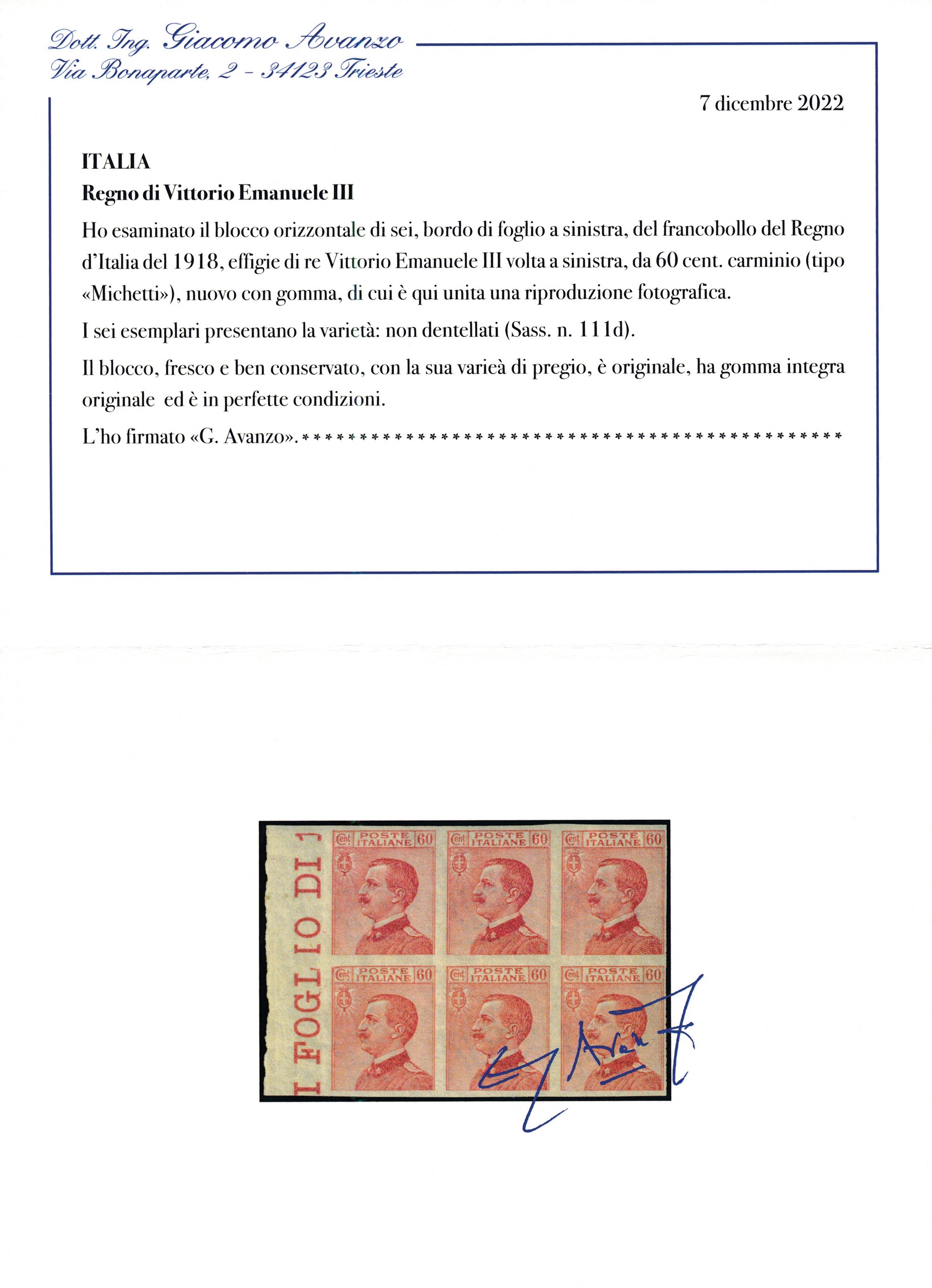 Gomma integra - Fabris, Cert. Sorani e Avanzo