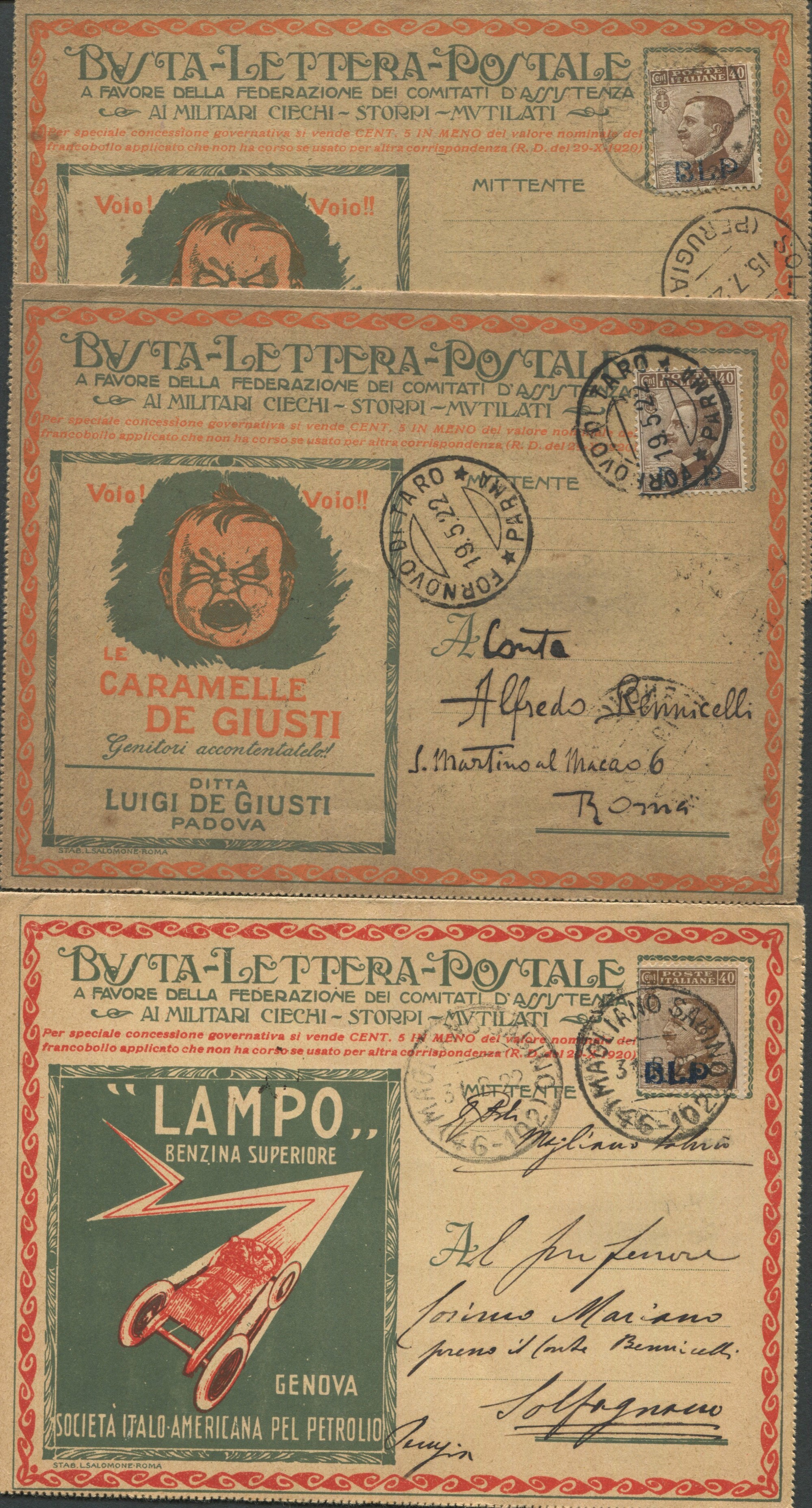 1922 - Regno d’Italia - Buste Lettere Parlanti - Due cartolina con tagliando serie nazionali “Caramelle De Giusti” ed una serie Lazio “Benzina Lampo” al retro “Automobili SCAT”. Le prime due affrancate con 40c. bruno, I tipo, soprastampa azzurra (Sass. 4) e la terza con 40c. bruno, II tipo, soprastampa azzurra (Sass. 9).