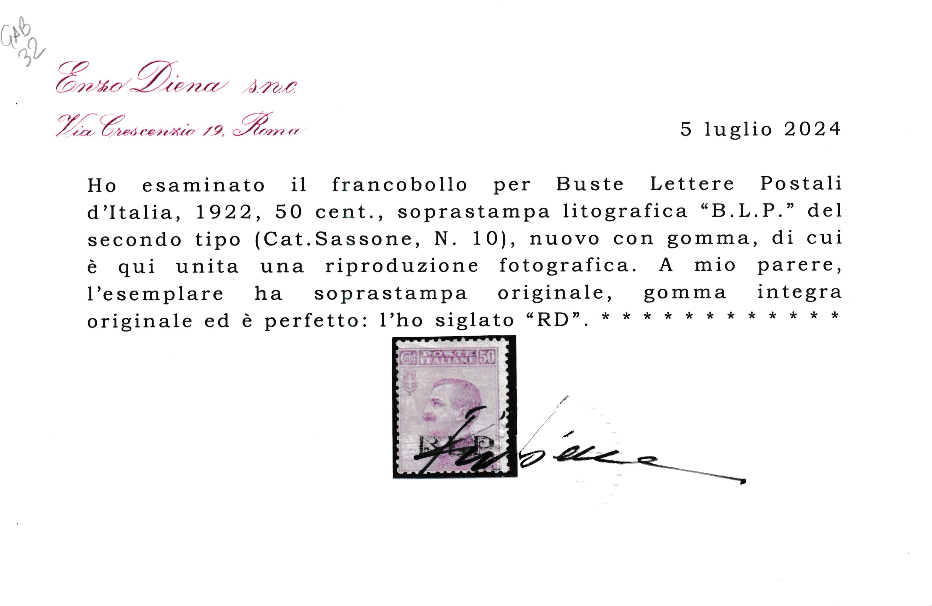 1922 – Regno d’Italia - Buste Lettere Postali – 50 cent. violetto, soprastampa “B.L.P.”, II tipo (Sass. 10).