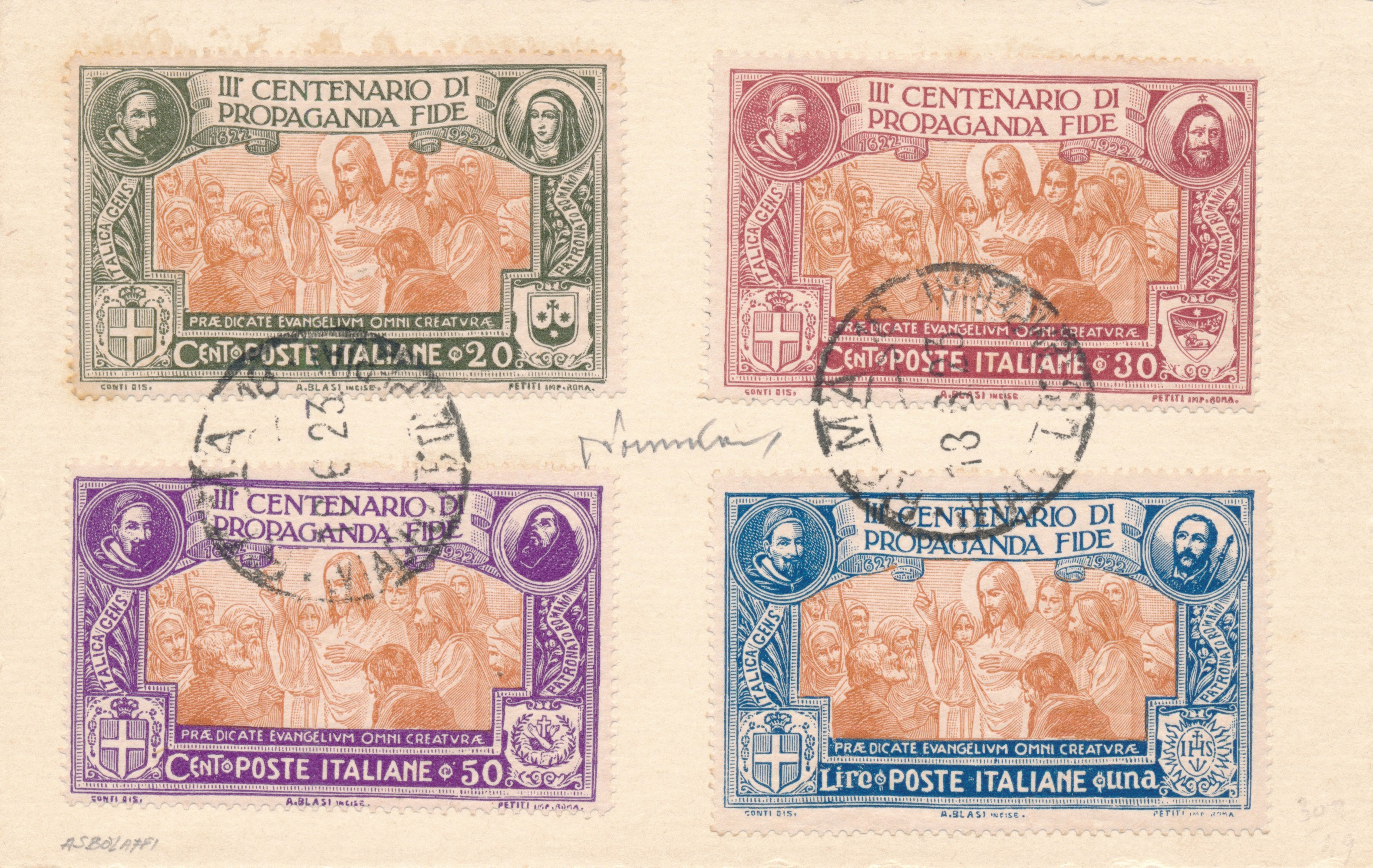 1923 – Regno d’Italia – “3° centenario della Congregazione di Propaganda fide” – Cartoncino con applicati i quattro valori della serie ed annullati (Sass. S.24).