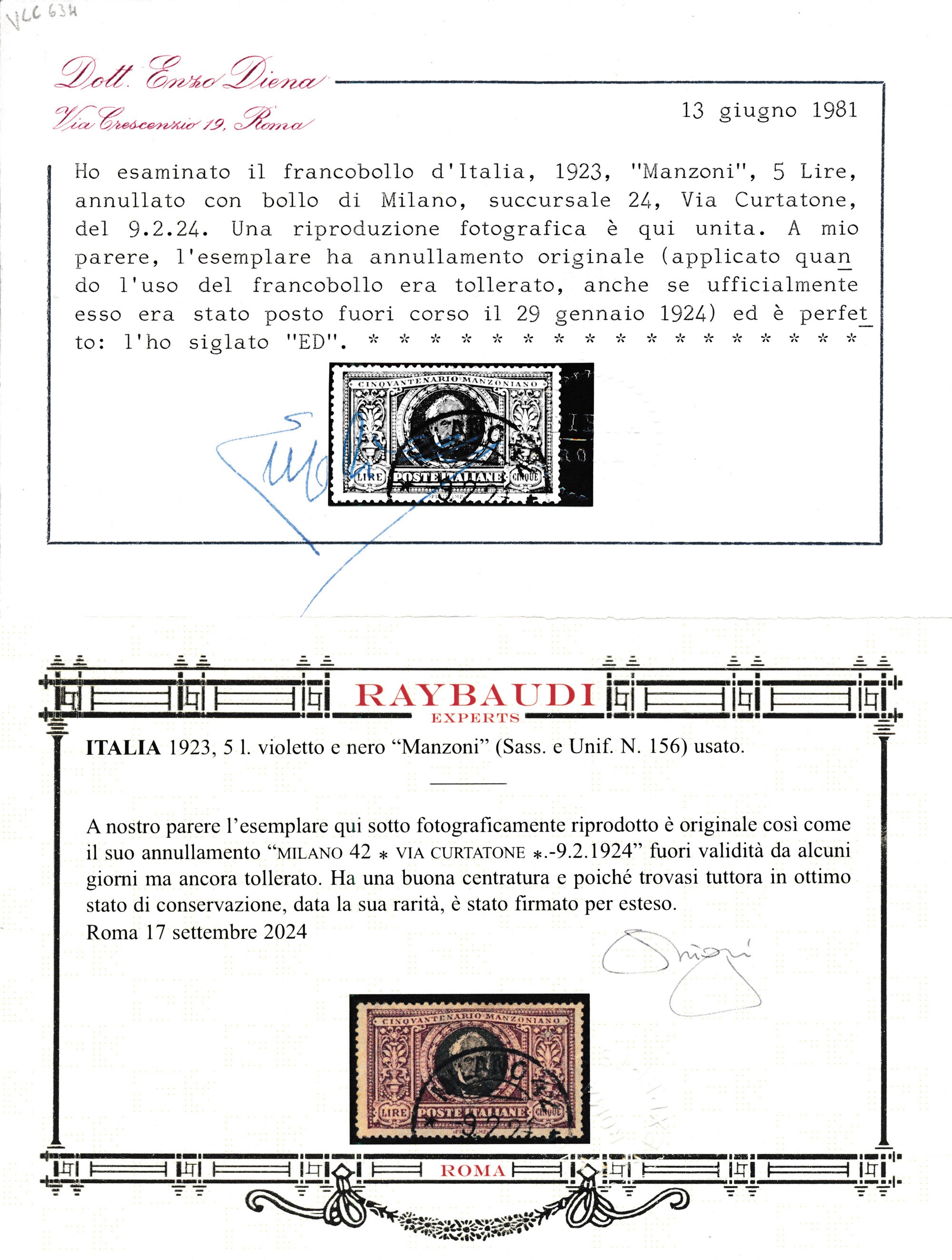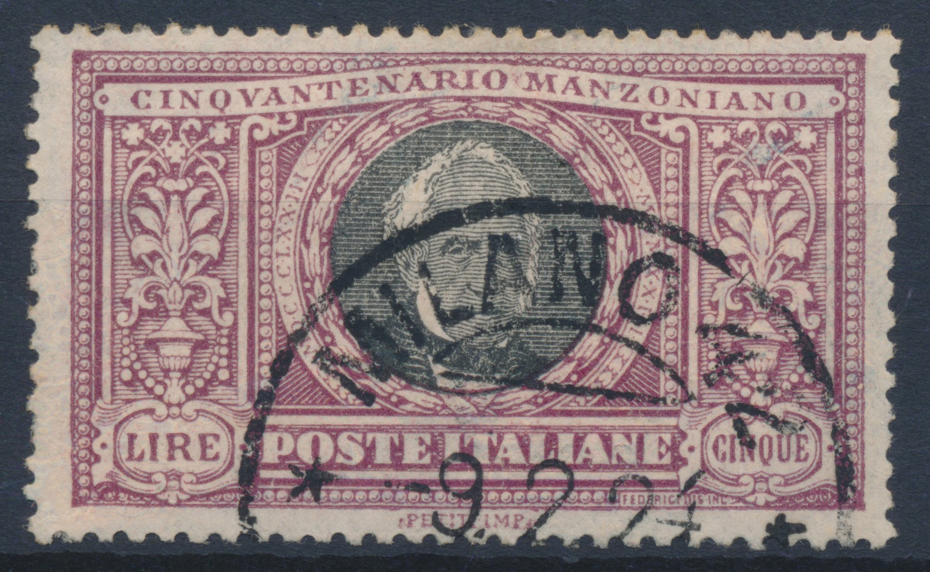 1923 – Regno d’Italia – Cinquantenario della morte di Alessandro Manzoni – 5 lire violetto e nero usato (Sass. 156) annullato con Annullo Circolare MILANO 42