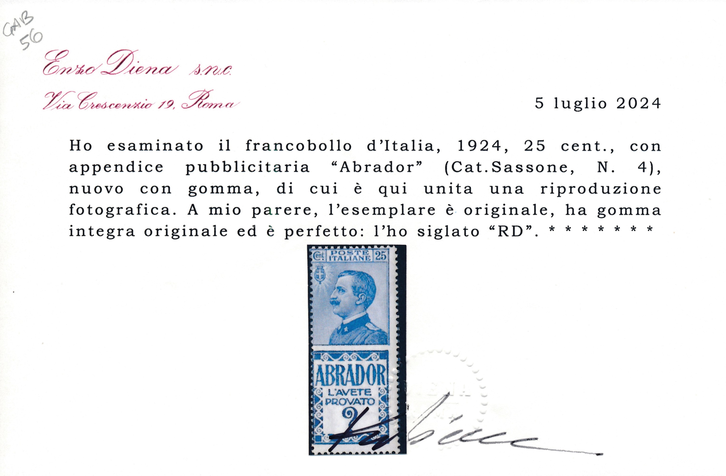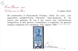 1924 – Regno d’Italia – Francobolli pubblicitari – 25 cent. azzurro e azzurro chiaro “ABRADOR” (Sass. 4).