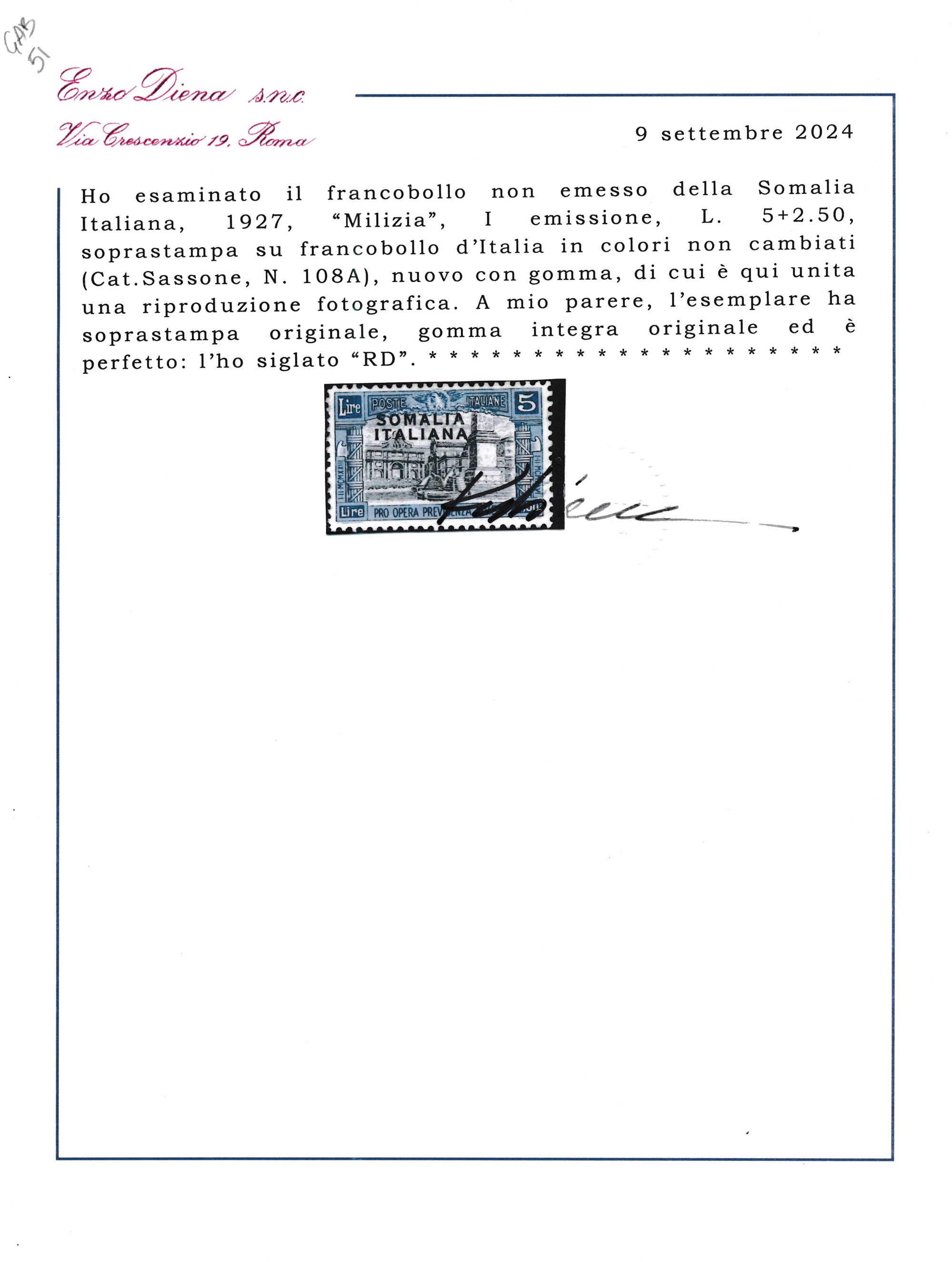 1927 – Regno d’Italia – Colonie – Somalia – Milizia I – 5 + 2,50 lire - Non emesso (Sass. 108A).