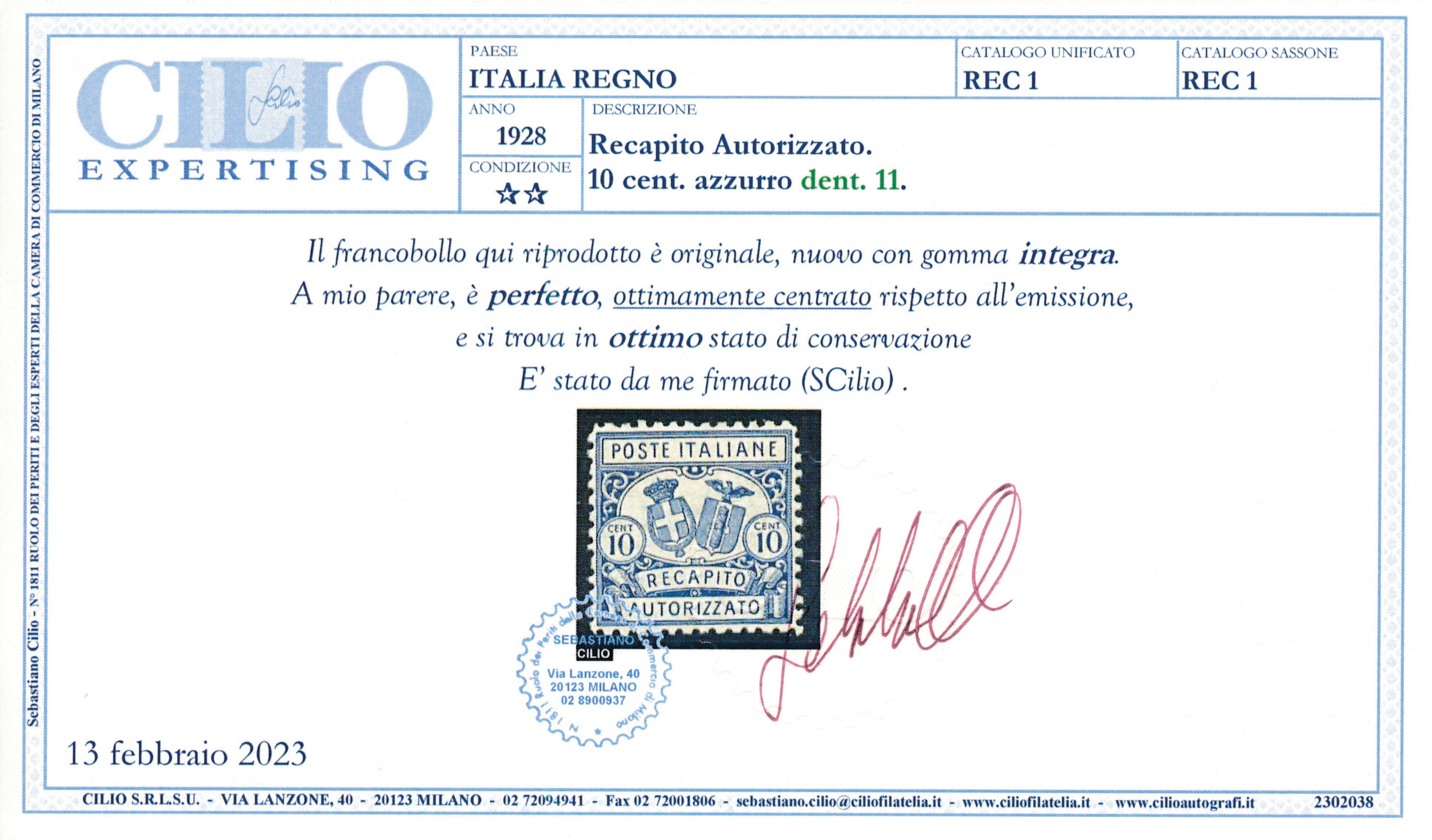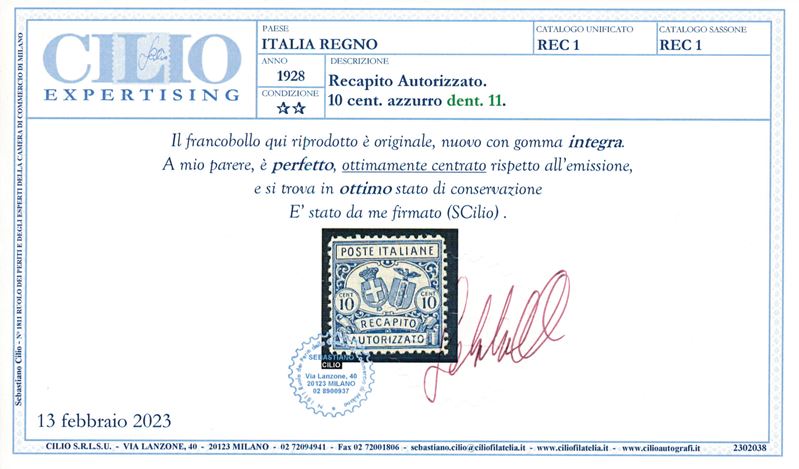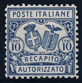 1928 – Regno d’Italia – Recapito autorizzato – 10 cent. azzurro (Sass. 1).