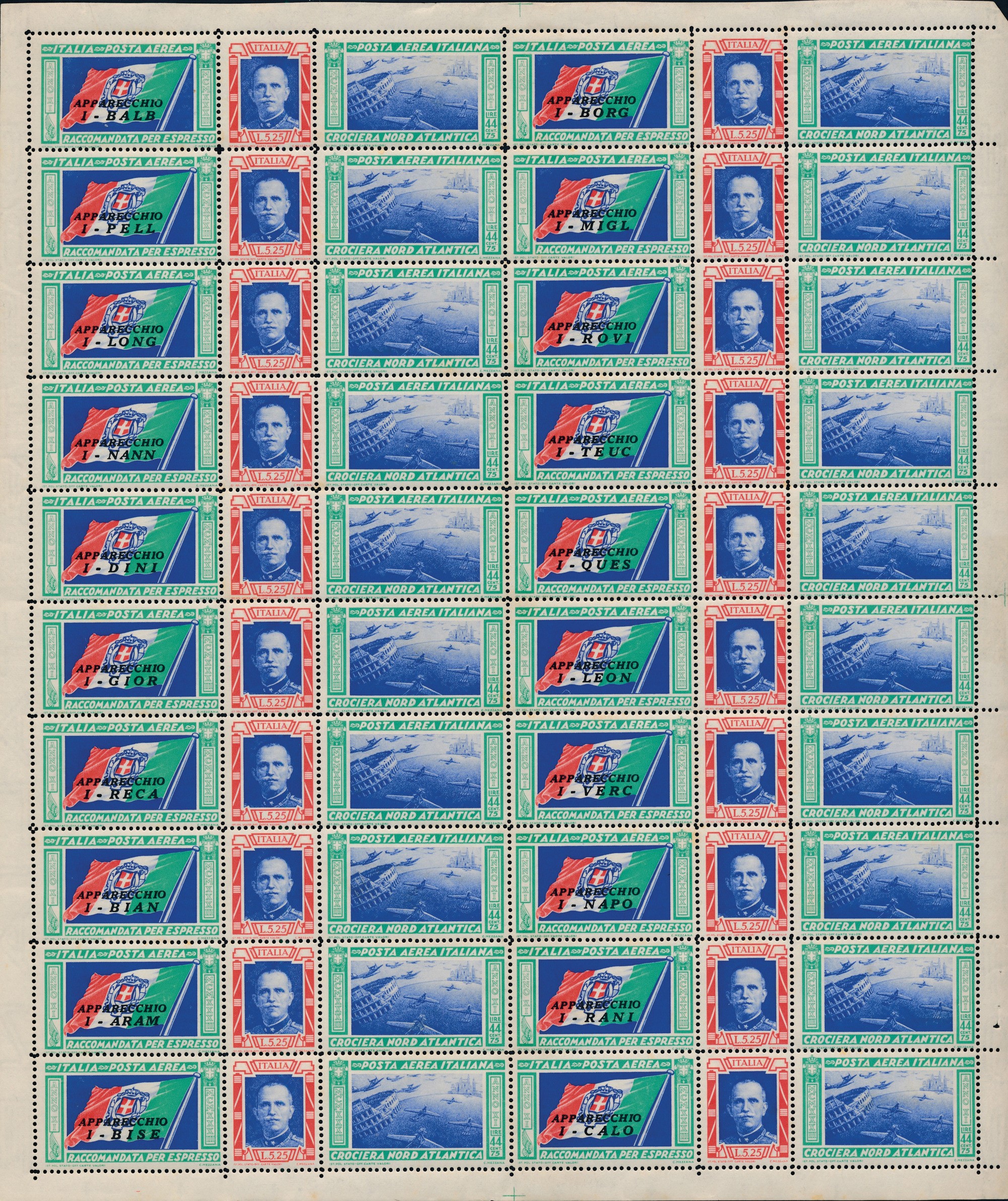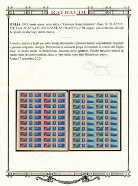 1933 – Regno d’Italia – Posta Aerea – Crociera aerea del Decennale – Trittici - La serie in due fogli completi (Sass. 51-5251T-52T).