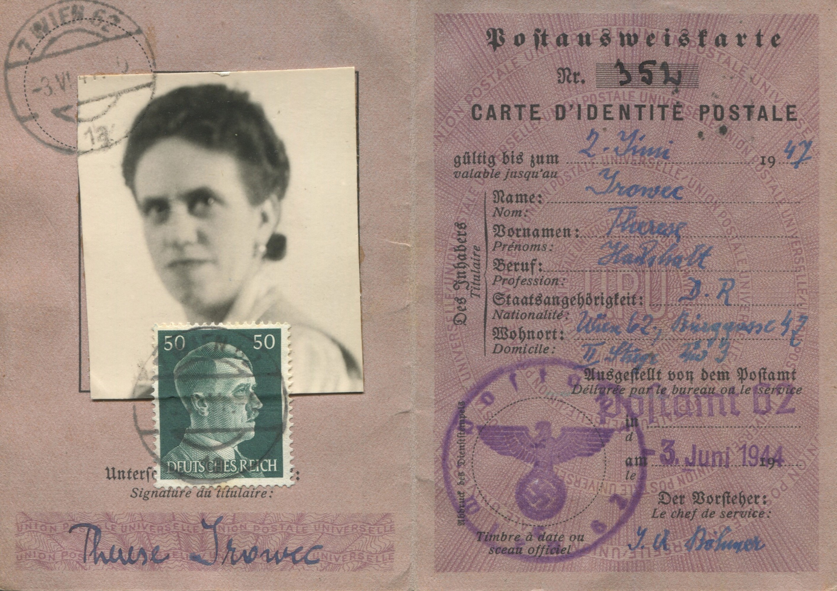 1944 - Austria - Tessera postale di riconoscimento con tariffa 50 pfenning.