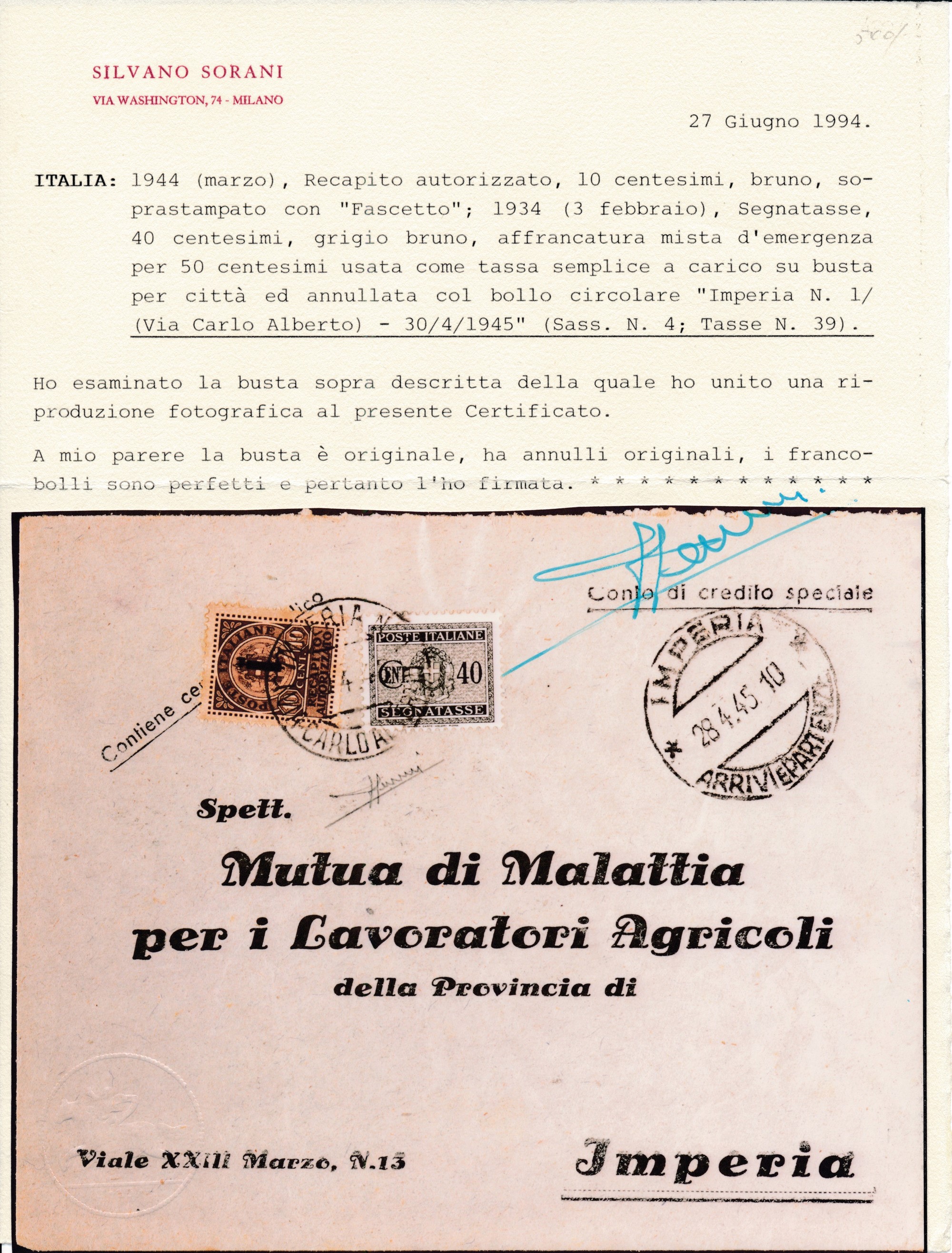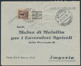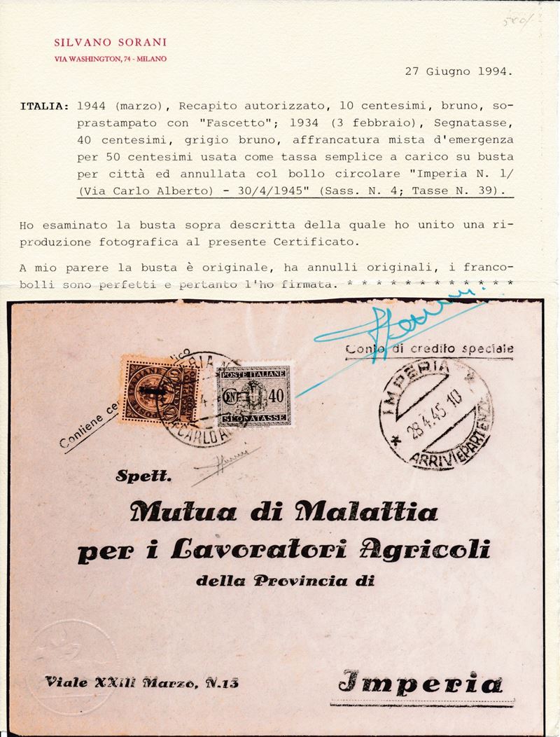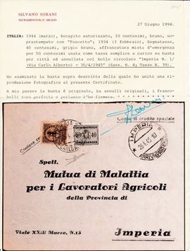 1944 – Repubblica Sociale Italiana – Recapito autorizzato – Busta da Imperia a città con 10 cent. bruno soprastampa “fascetto” e, Regno 1934, 40 cent. grigio bruno (Sass. 4 e 39) in affrancatura mista d’emergenza per 50c. come tassa semplice a carico annullo circolare IMPERIA n. 1