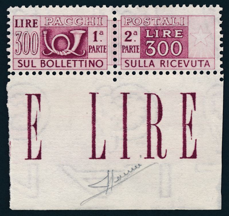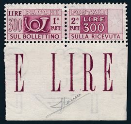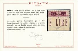 1948 – Repubblica italiana – Pacchi postali – 300 lire lilla bruno, filigrana ruota I tipo, bdf (Sass. 79).