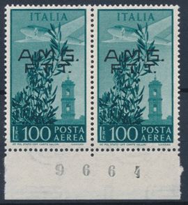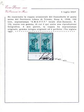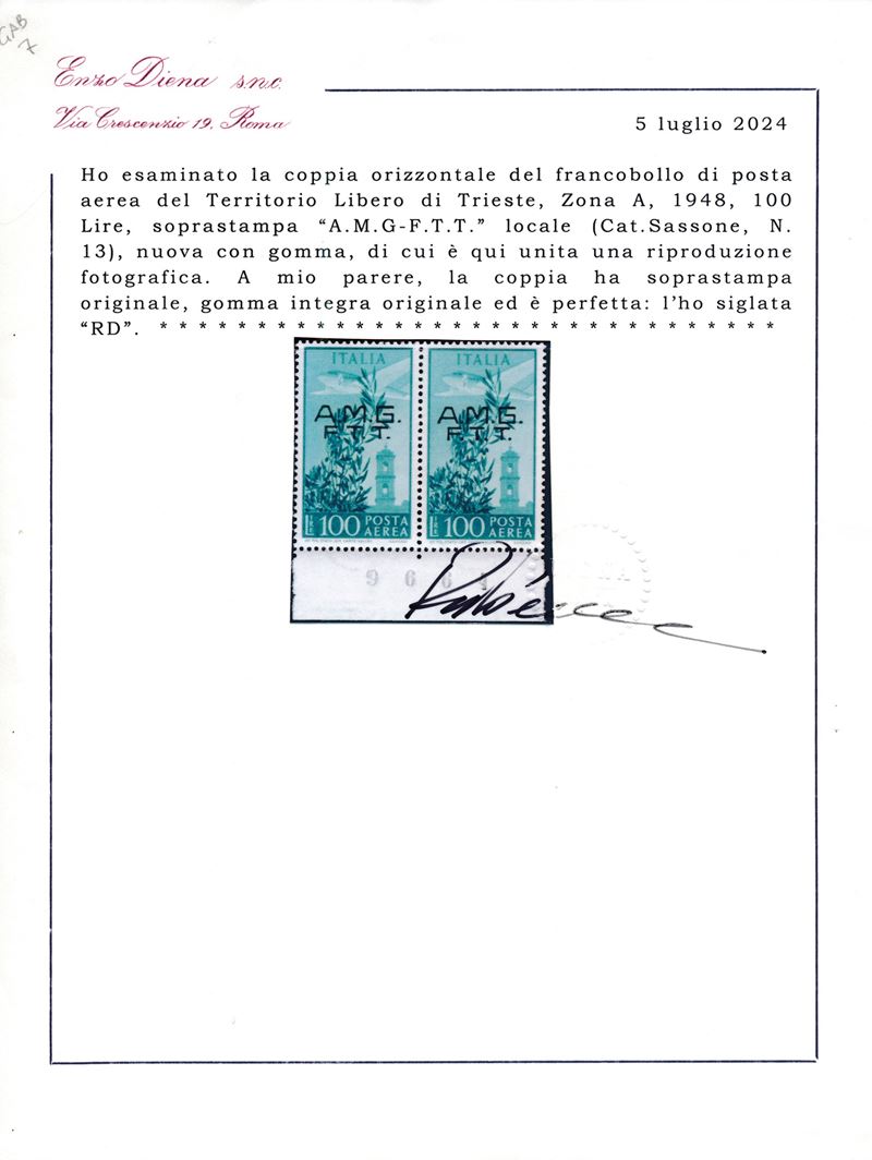 1948 – Territorio libero di Trieste – Zona A – Posta aerea - 100 lire verde azzurro, coppia orizzontale bdf, soprastampata localmente “A.M.G.