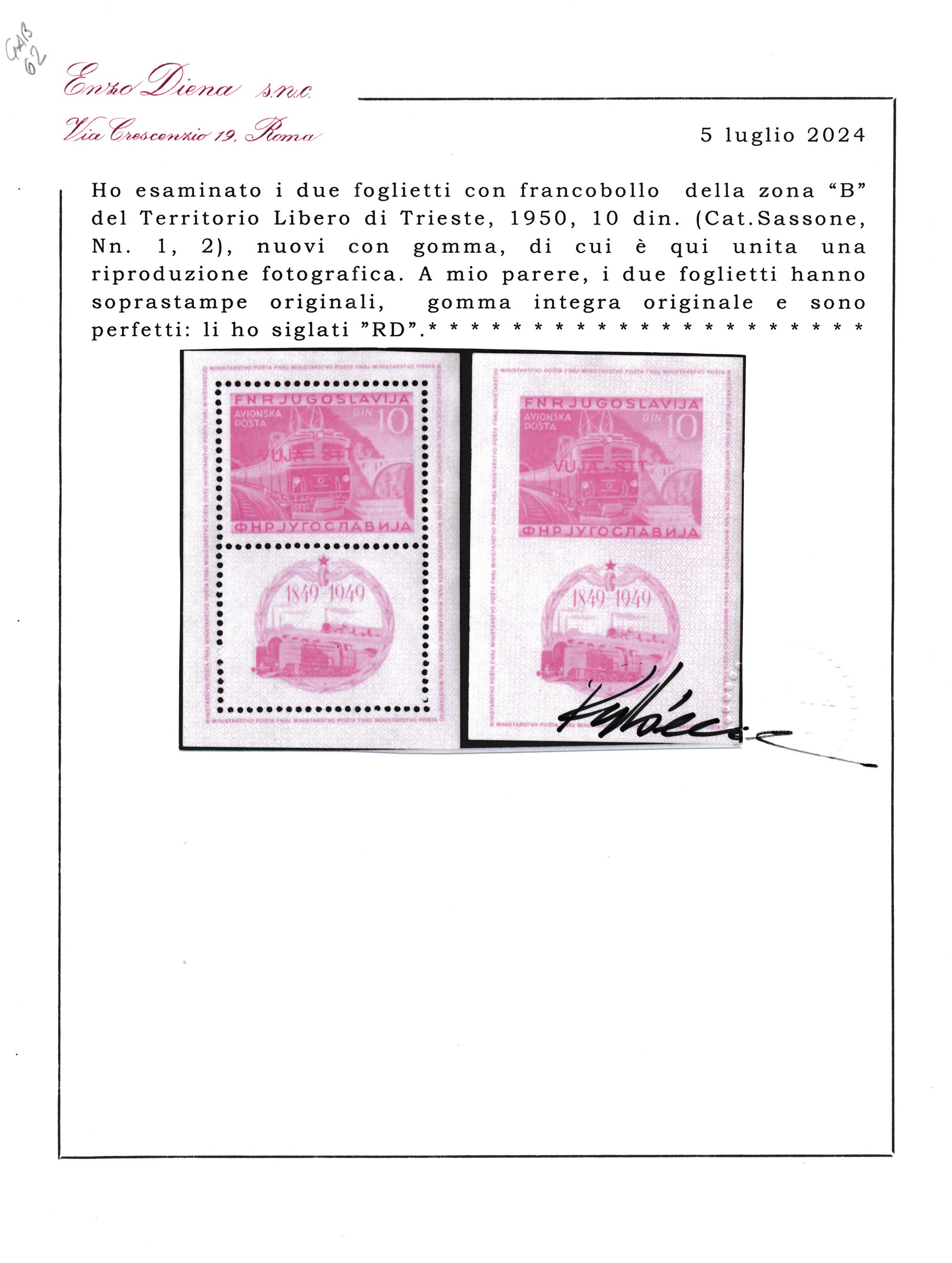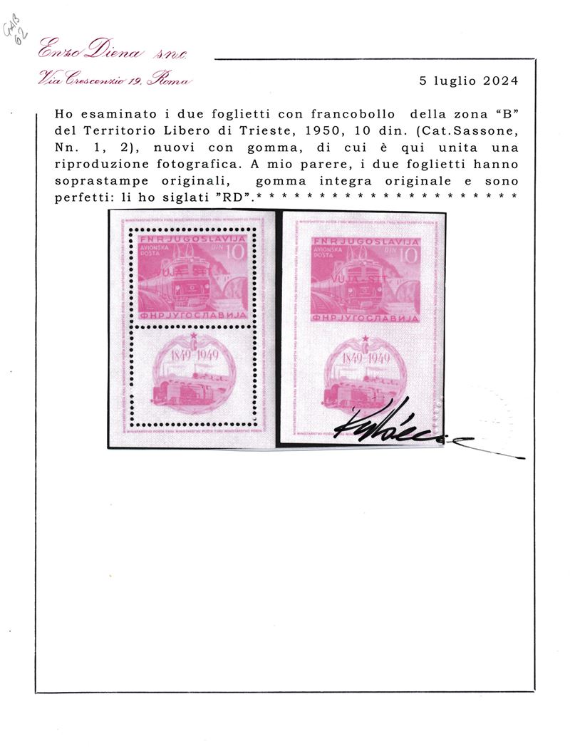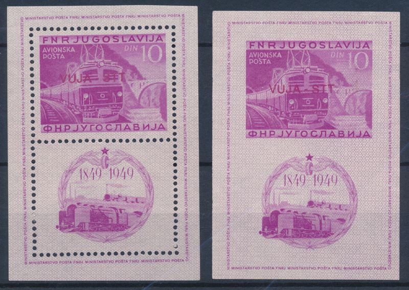 1948 - Territorio libero di Trieste – Zona B – Foglietti - “Centenario delle ferrovie jugoslave”, 10 d. lilla rosa, foglietto dentellato e non dentellato (Sass. 1, 2).