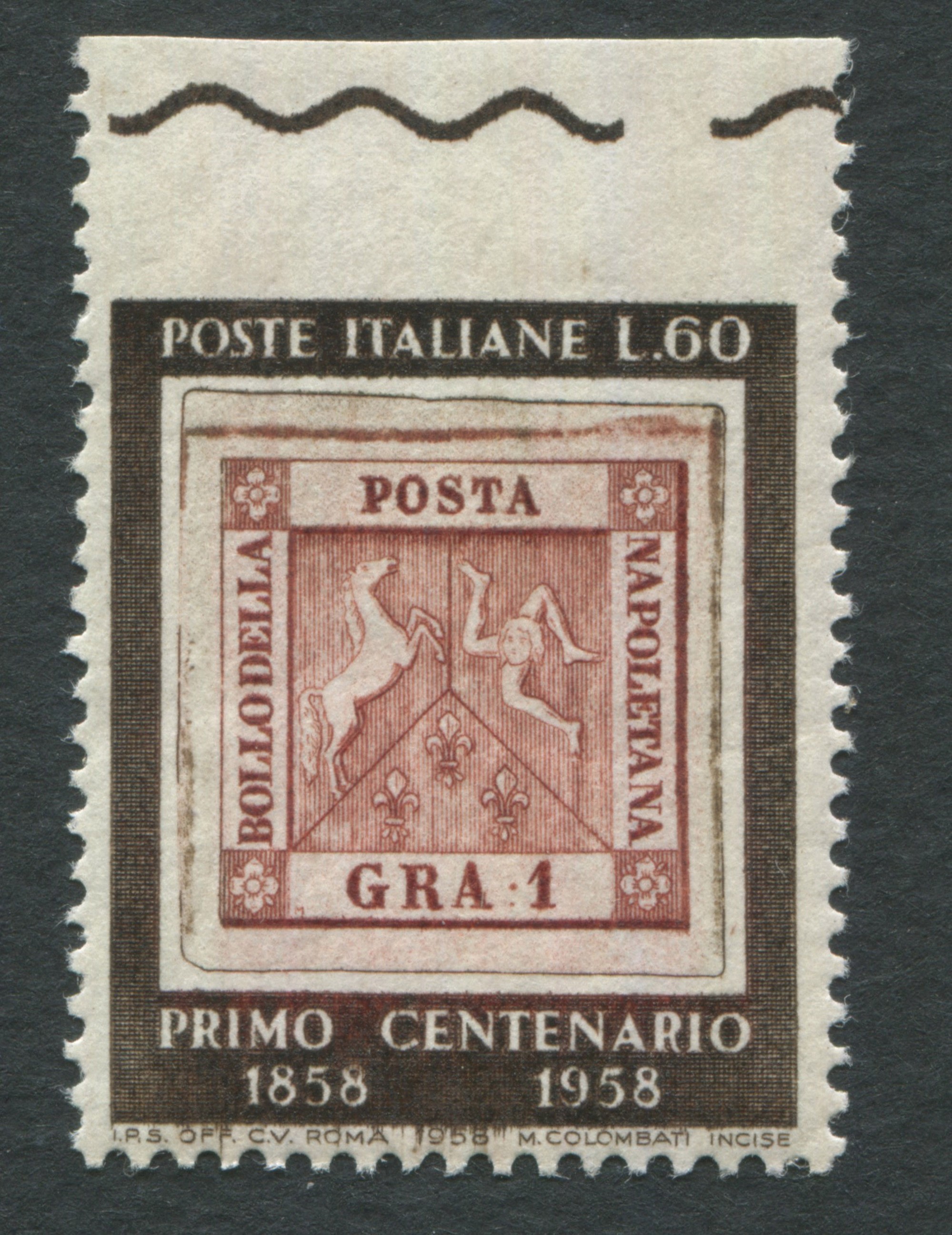 1958 - Repubblica italiana - Centenario dei primi francobolli di Napoli - 60 lire bruno nero e bruno rosso non dentellato [..]