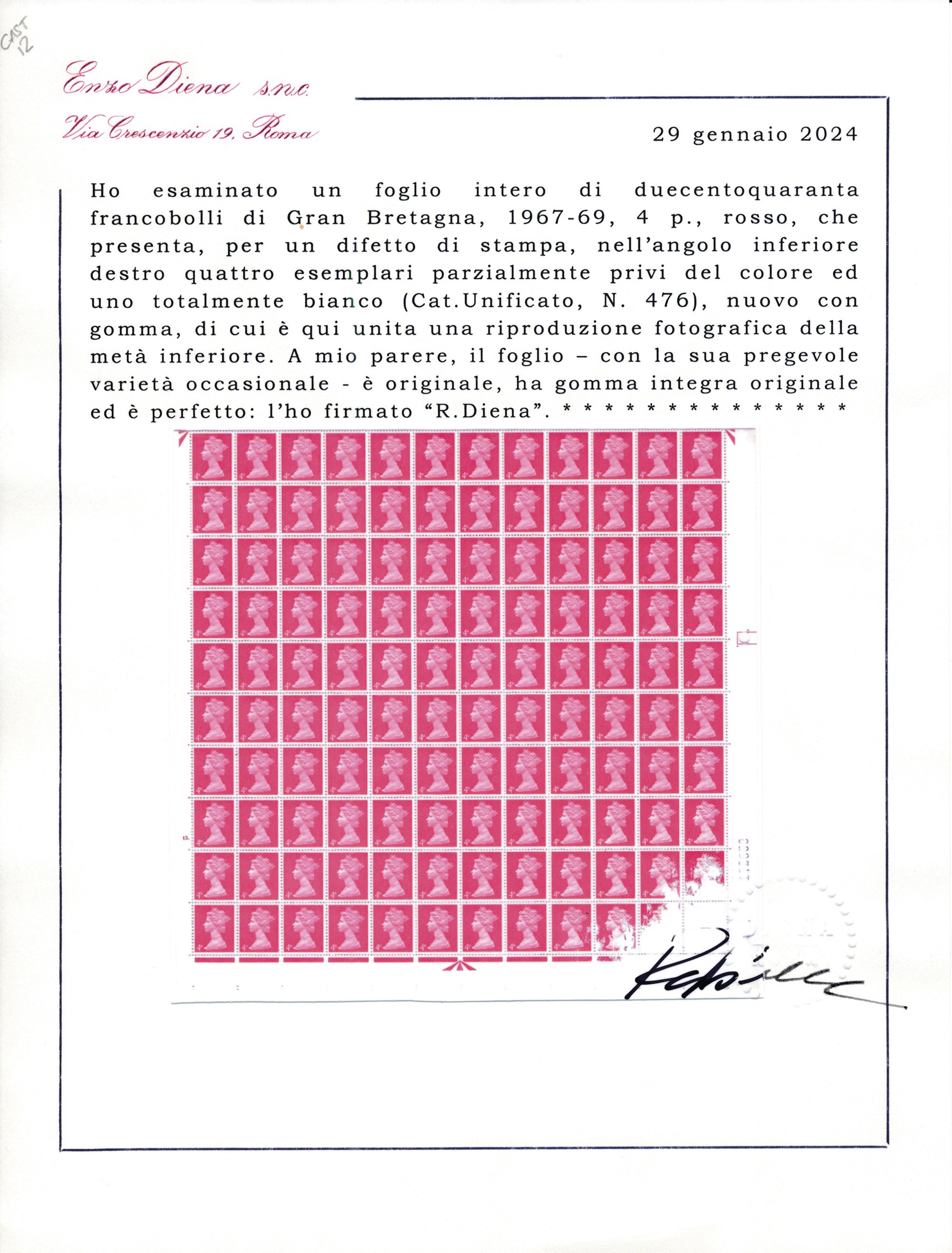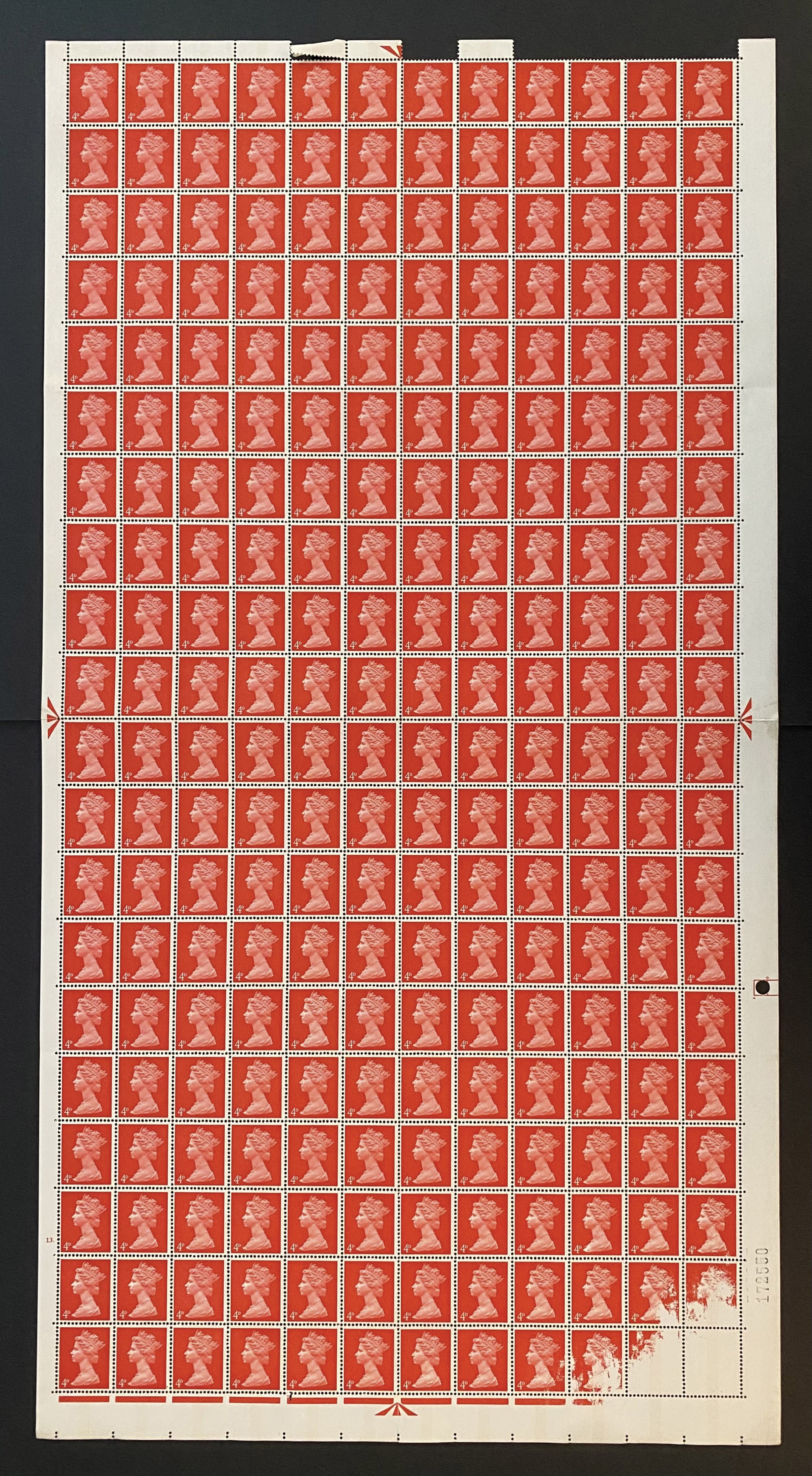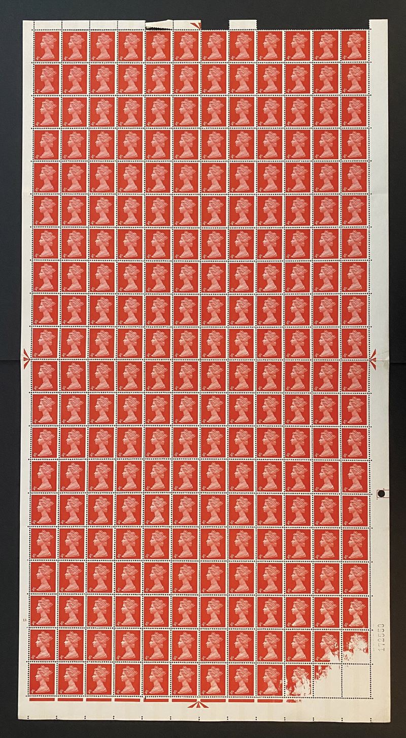 1967-69 – Gran Bretagna - Foglio intero di 240 francobolli, 1967-1969, 4 penny rosso (Unif. 476), con difetto di stampa nell'angolo inferiore destro con quattro esemplari parzialmente privi del colore ed uno totalmente bianco.