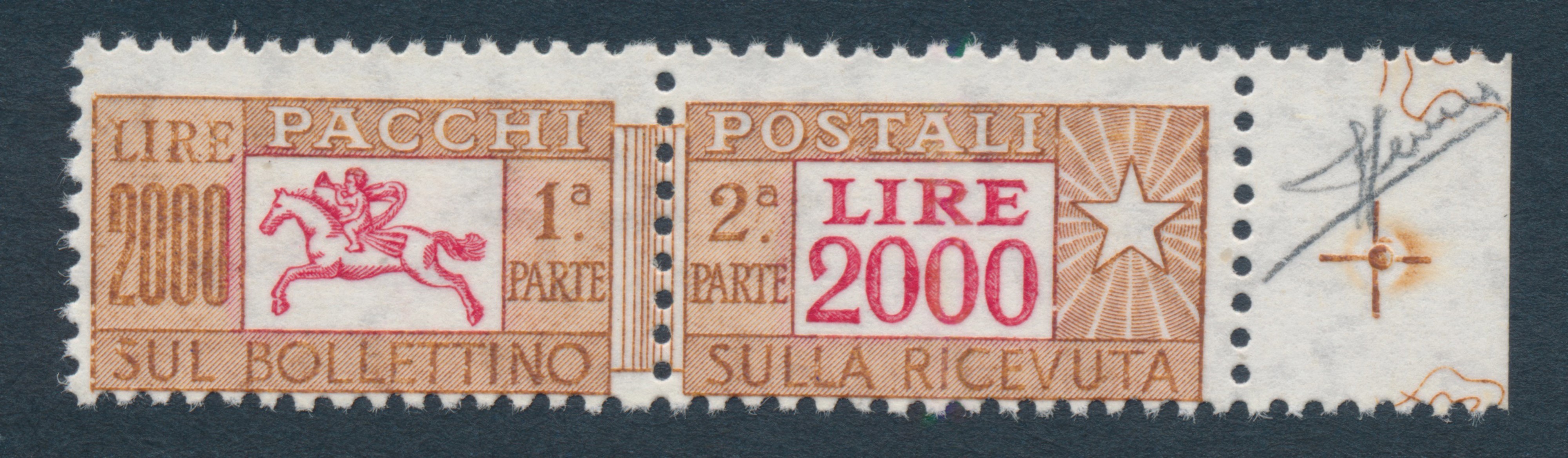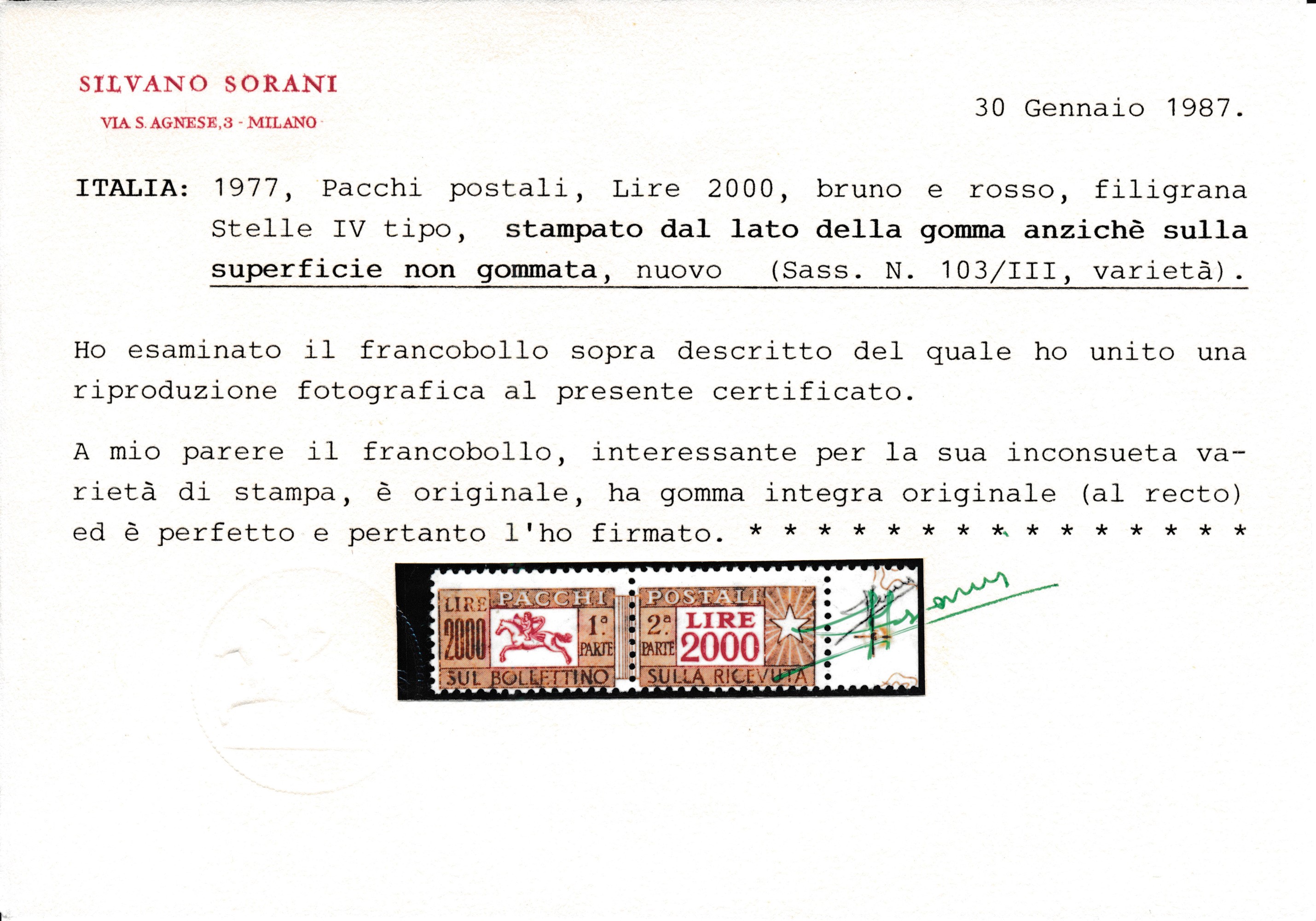 1977 - Repubblica Italiana - Pacchi postali - 2.000 lire bruno e rosso bdf, filigrana stelle IV tipo - Varietà: stampa sul lato della gomma anzichè sulla superficie non gommata (Sass. 103/III, varietà)