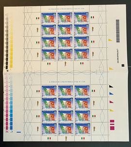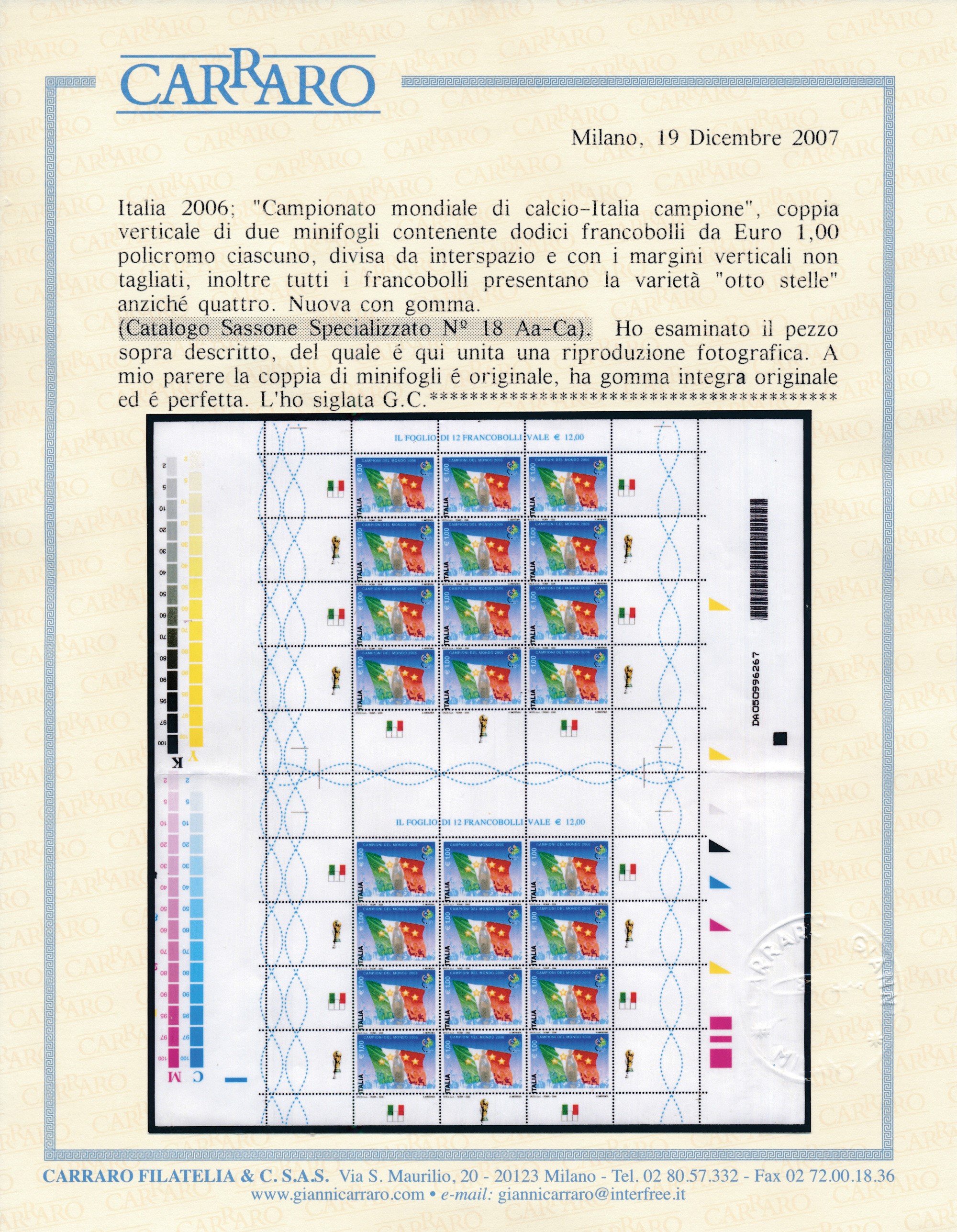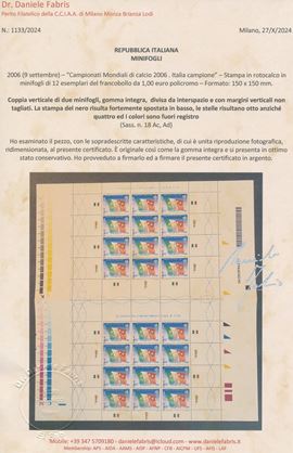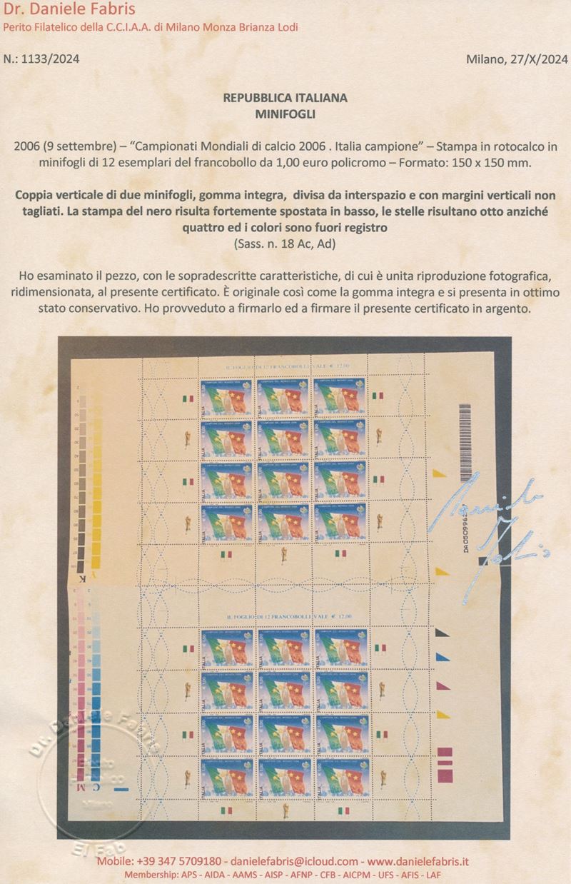 2006 - Repubblica italiana - Minifogli - “Campionato mondiale di calcio 2006. Italia campione” - Coppia verticale di due minifogli contenenti dodici francobolli da 1,00 euro divisa da interpazio e con margini verticali non tagliati, inoltre tutti i francobolli presentano la varietà “otto stelle” e colori fuori registro (Sass. Spec. 18 Aa-Ad-Ca).
