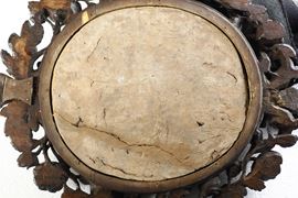 Rilievo in terracotta entro cornice in legno intagliato con motivi floreali.