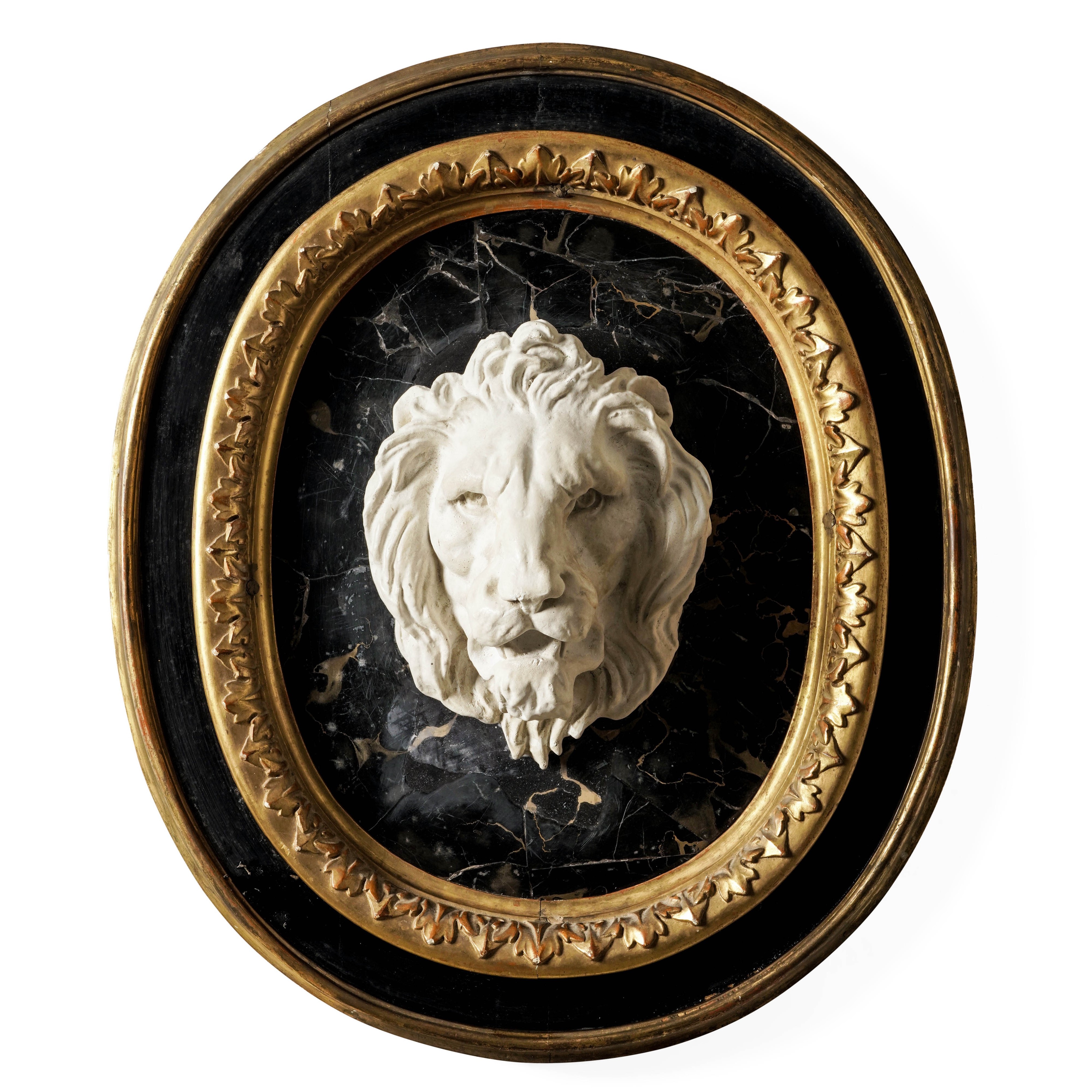 Italia centrale, XVIII-XIX secolo Testa di leone neoclassica su ovale in pietra lastronata in marmo Portoro
