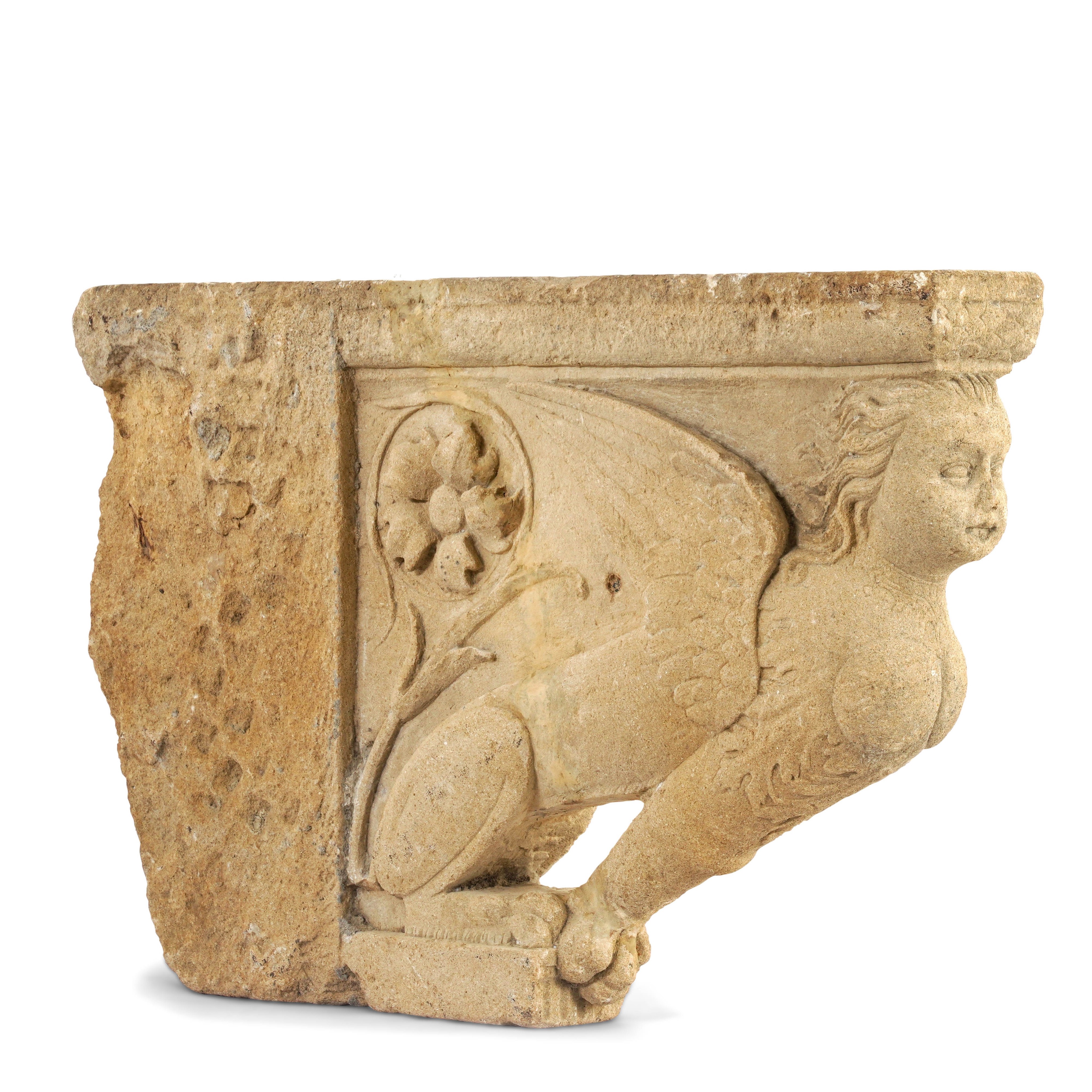 Lapicida rinascimentale. Italia meridionale (Puglia ?) XV-XVI secolo Grande mensola architettonica sorretta da protome a forma di sfinge