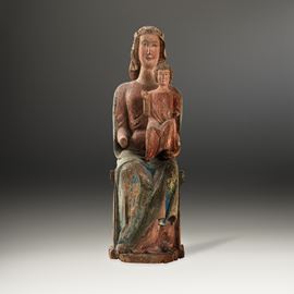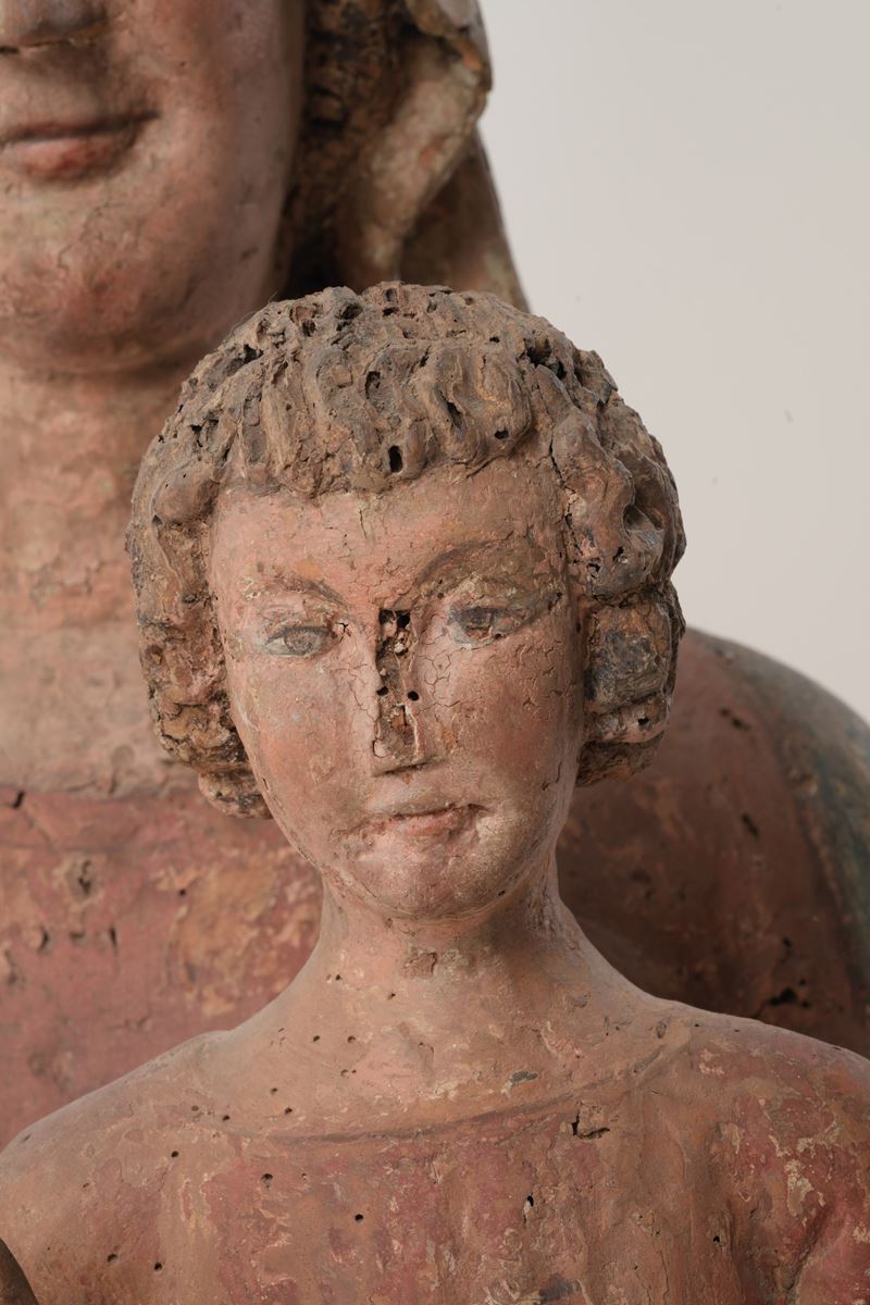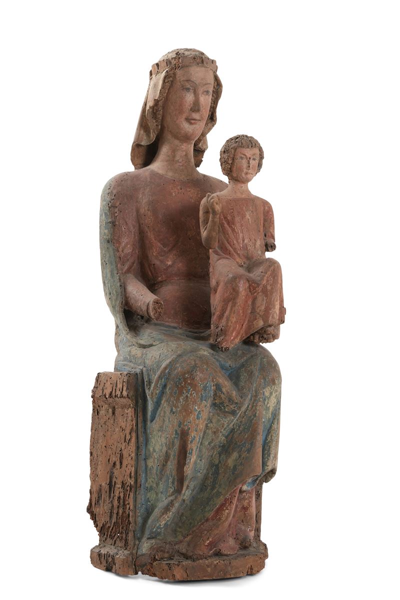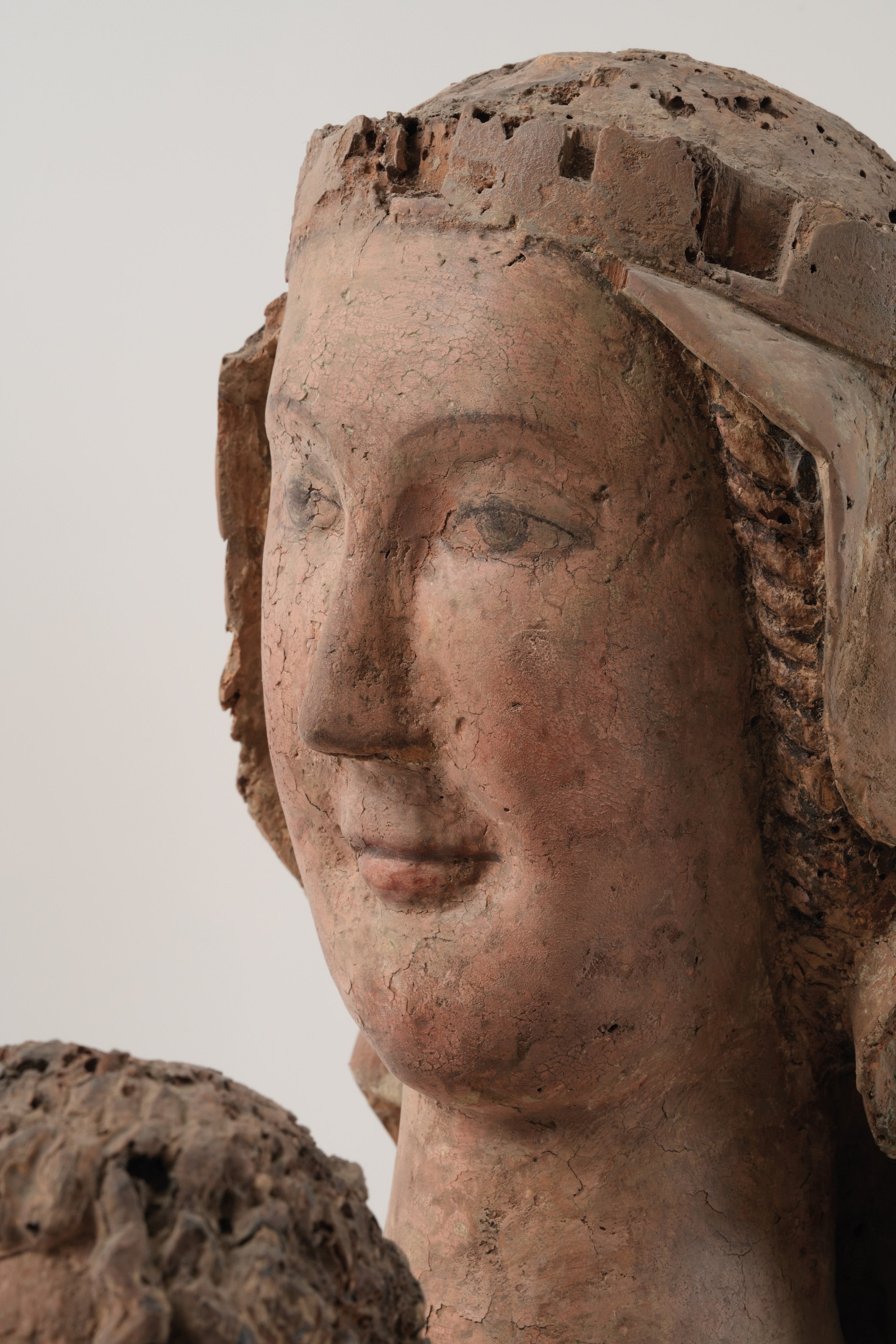 La rara opera medievale con la figura della Vergine assisa dal volto illuminato da un enigmatico sorriso mentre regge e mostra uno ieratico Gesù Benedicente vestito da una lunga tunica e dal viso incorniciato da un elaborata acconciatura a larghe ciocche derivata dai modelli della classicità antica può essere accostata alla produzione di maestà lignee del XVII-XIV secolo tra Umbria e Abruzzo dove operarono importanti scultori come il Maestro della Santa Caterina Gualino. L'opera è descritta in una missiva epistolare datata Novembre 1984 vergata dalla mano del professor Enzo Carli come 'una scultura di indubbio interesse e degna anche per la sua epoca - piuttosto verso gli inizi che verso la fine della prima metà del XIV secolo - di figurare in una buona raccolta.'