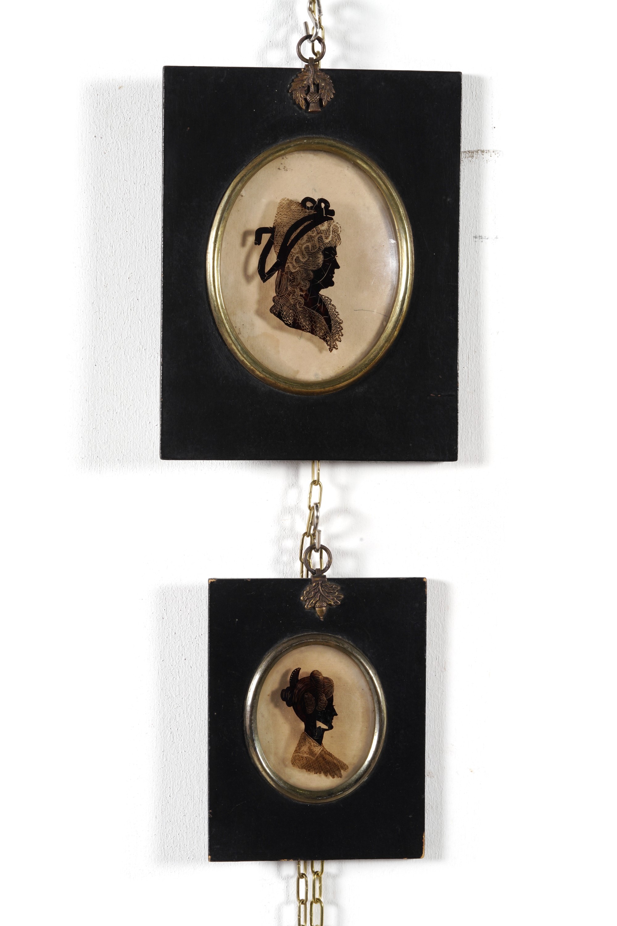 Due dipinti su vetro con profili femminili, ghiere in bronzo e cornici ebanizzate