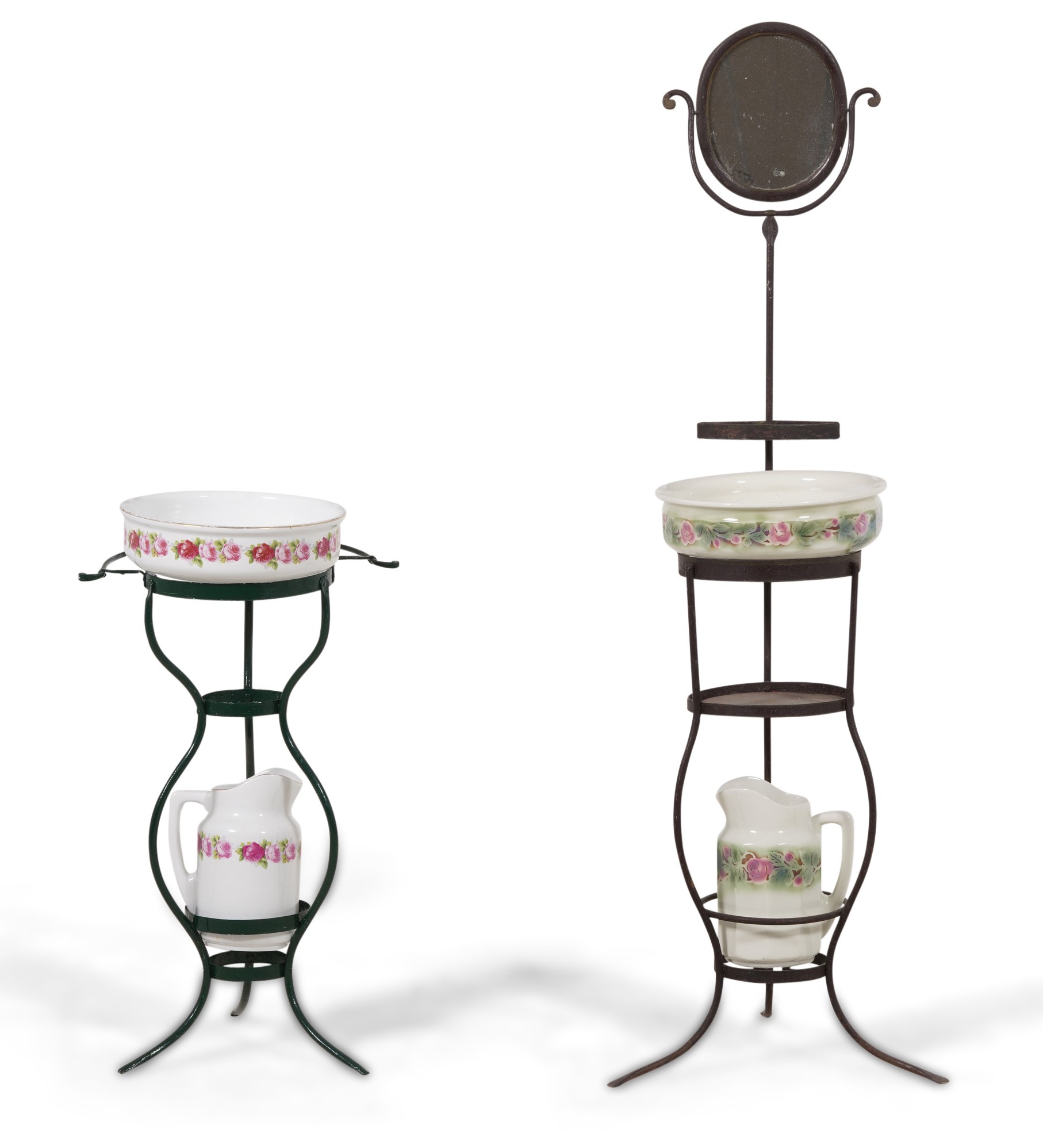 Due set da toilette in ferro battuto e ceramica. XX secolo
