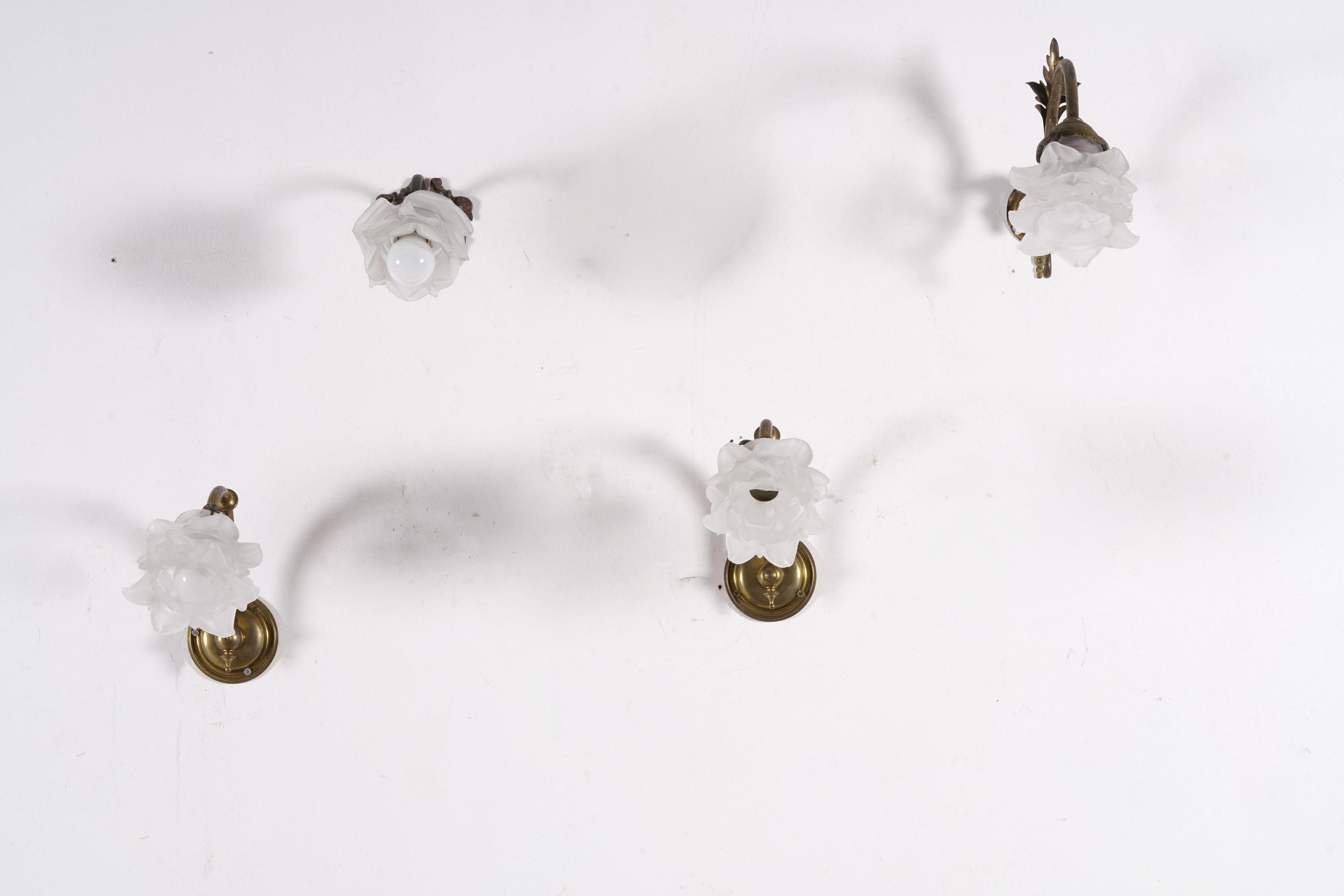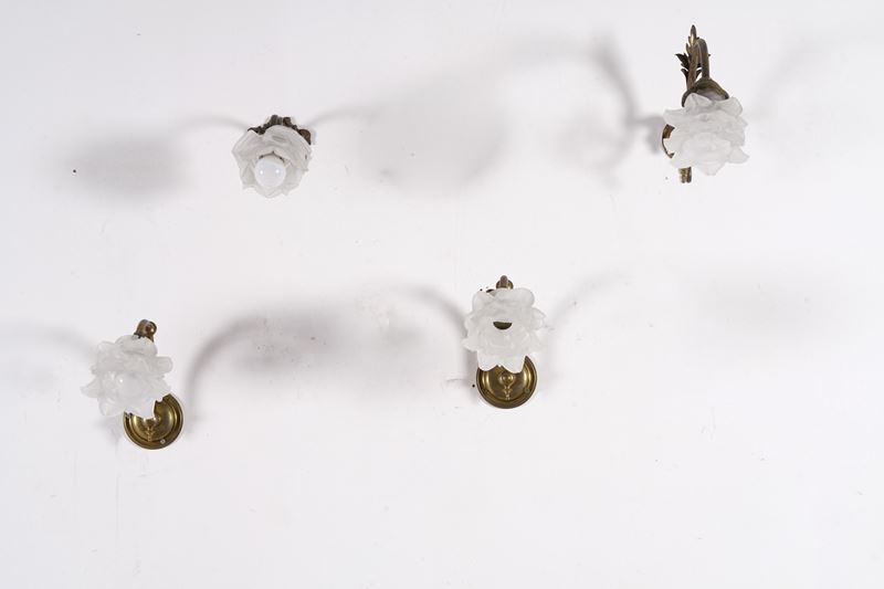 Quattro appliques in metallo dorato e diffusore in vetro satinato. XX secolo