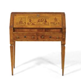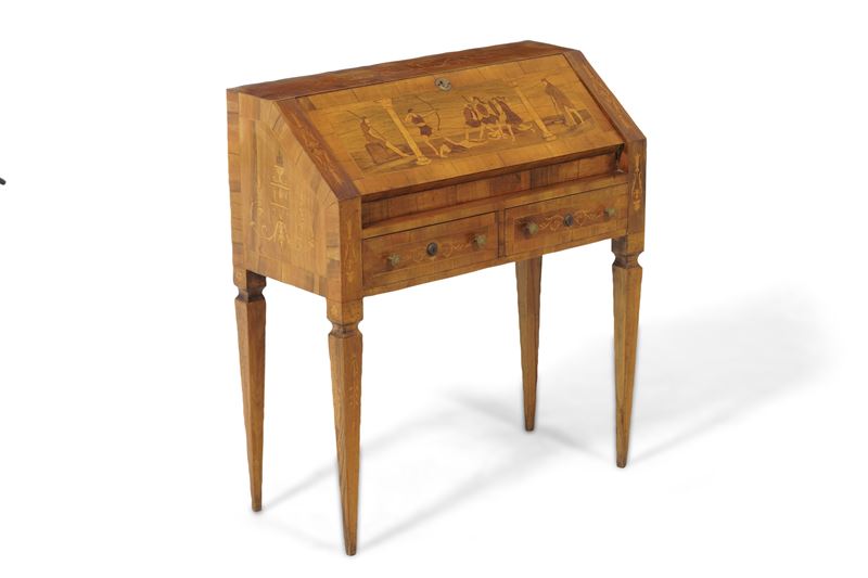 Scrittoio a ribalta lastronato e intarsiato. XX secolo
