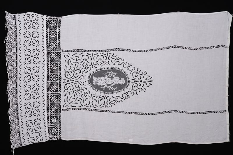 Tenda ricamata con figura femminile entro ovale frangia con decori geometrici