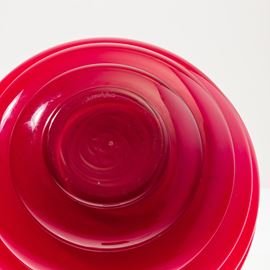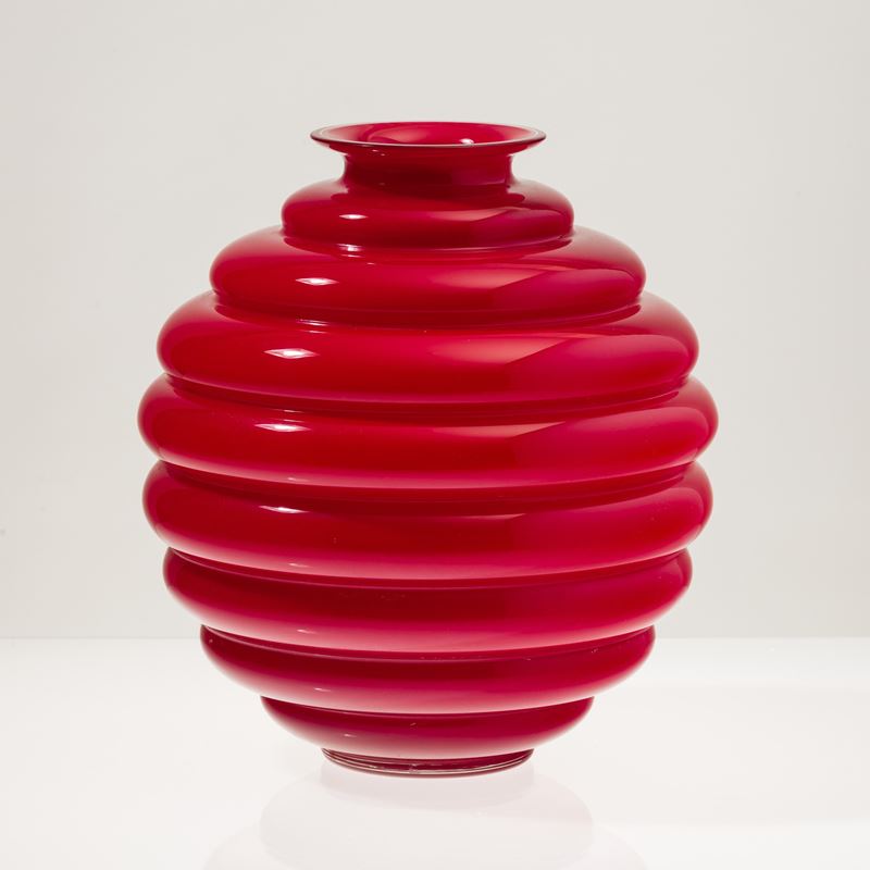 Spherical Deco vase with horizontal ribbing in red opaline blown glass.