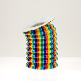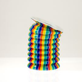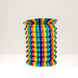 Vase in opaline blown glass molded in the shape of a paper lantern with vertical polychrome canes decoration.
