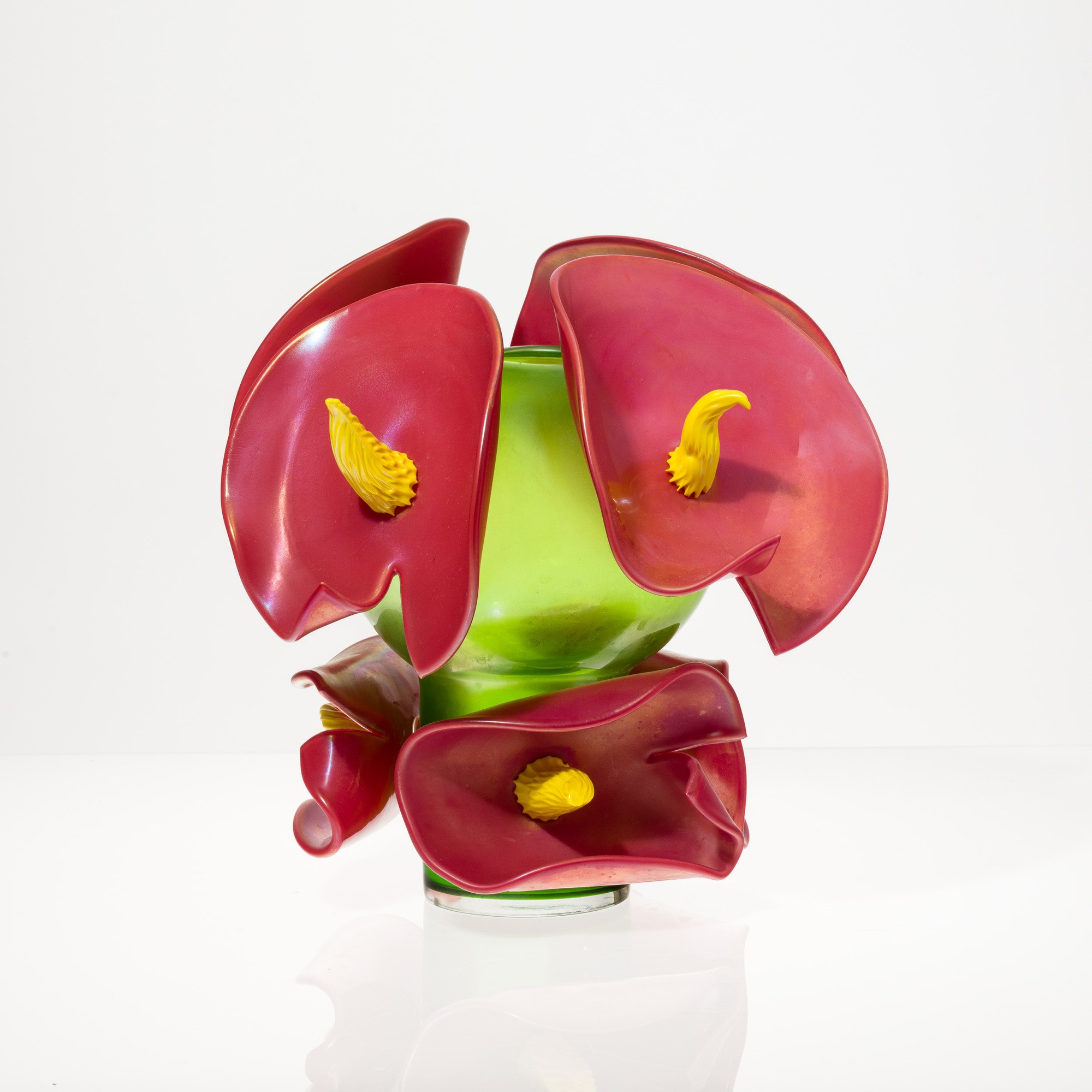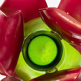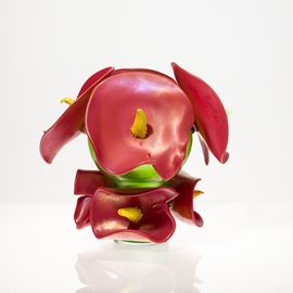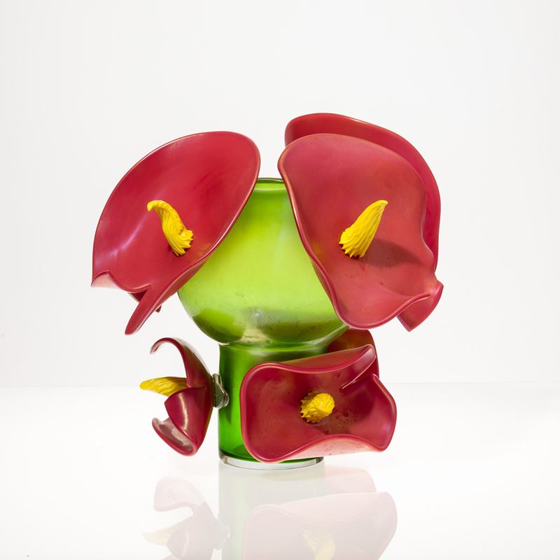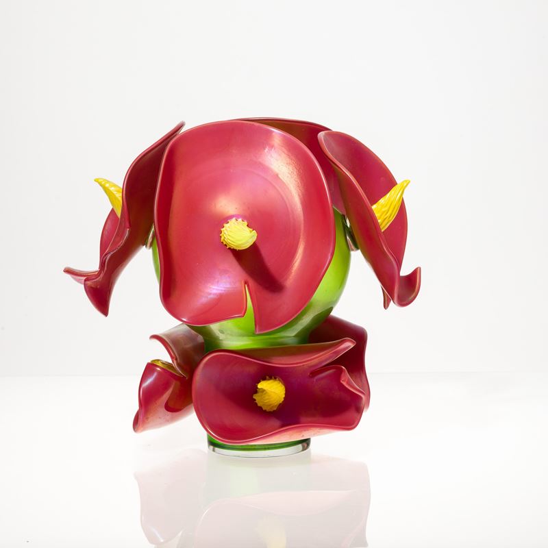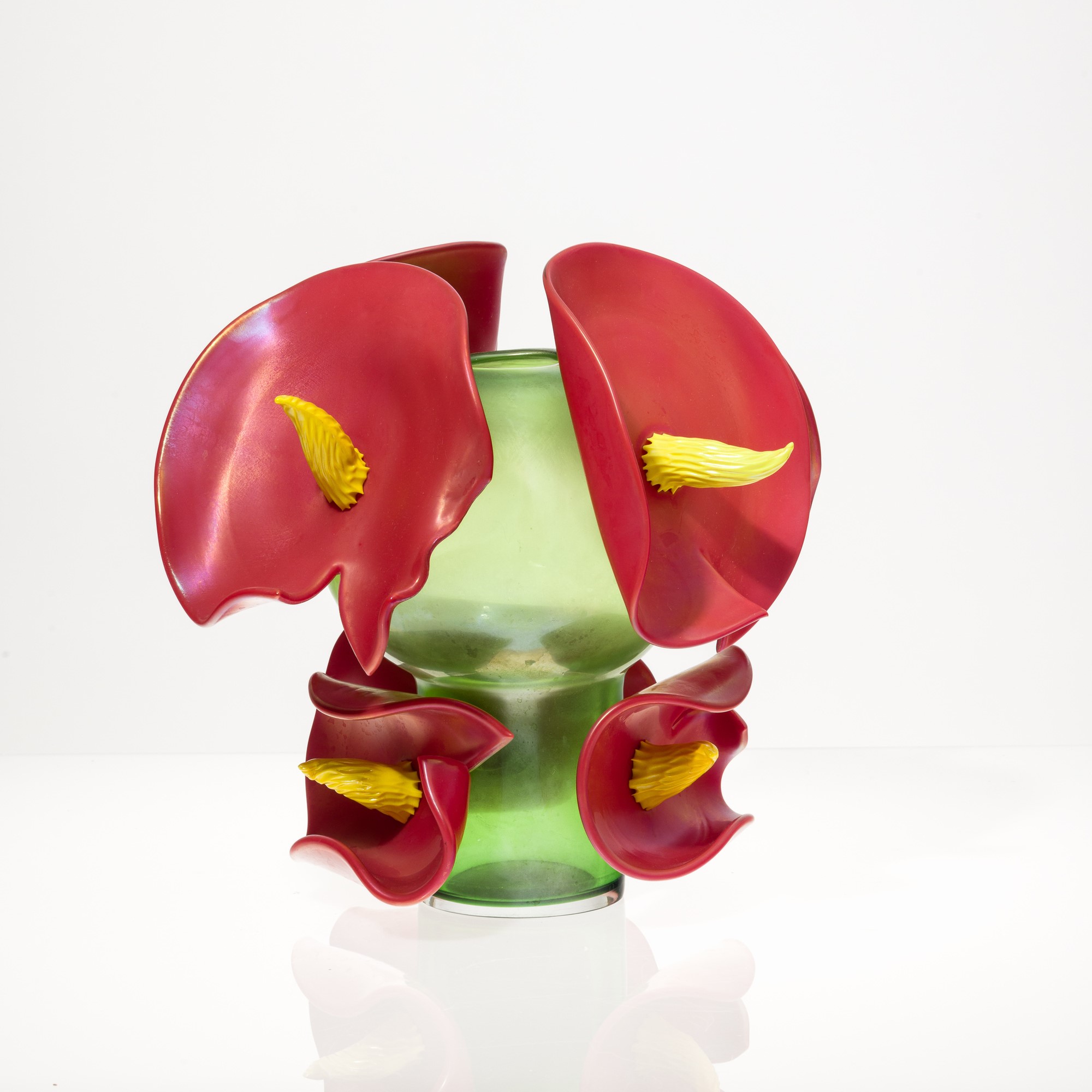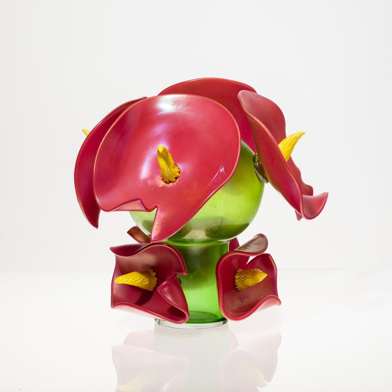 Anthurium vase in blown glass with leaf-shaped iridescent glass applications.
