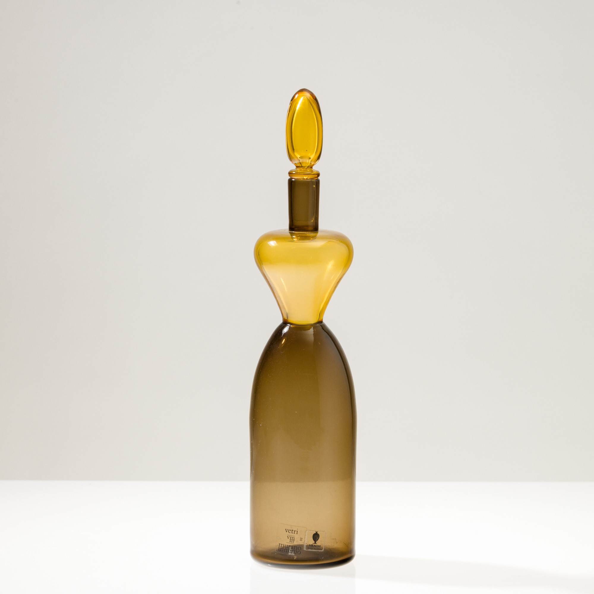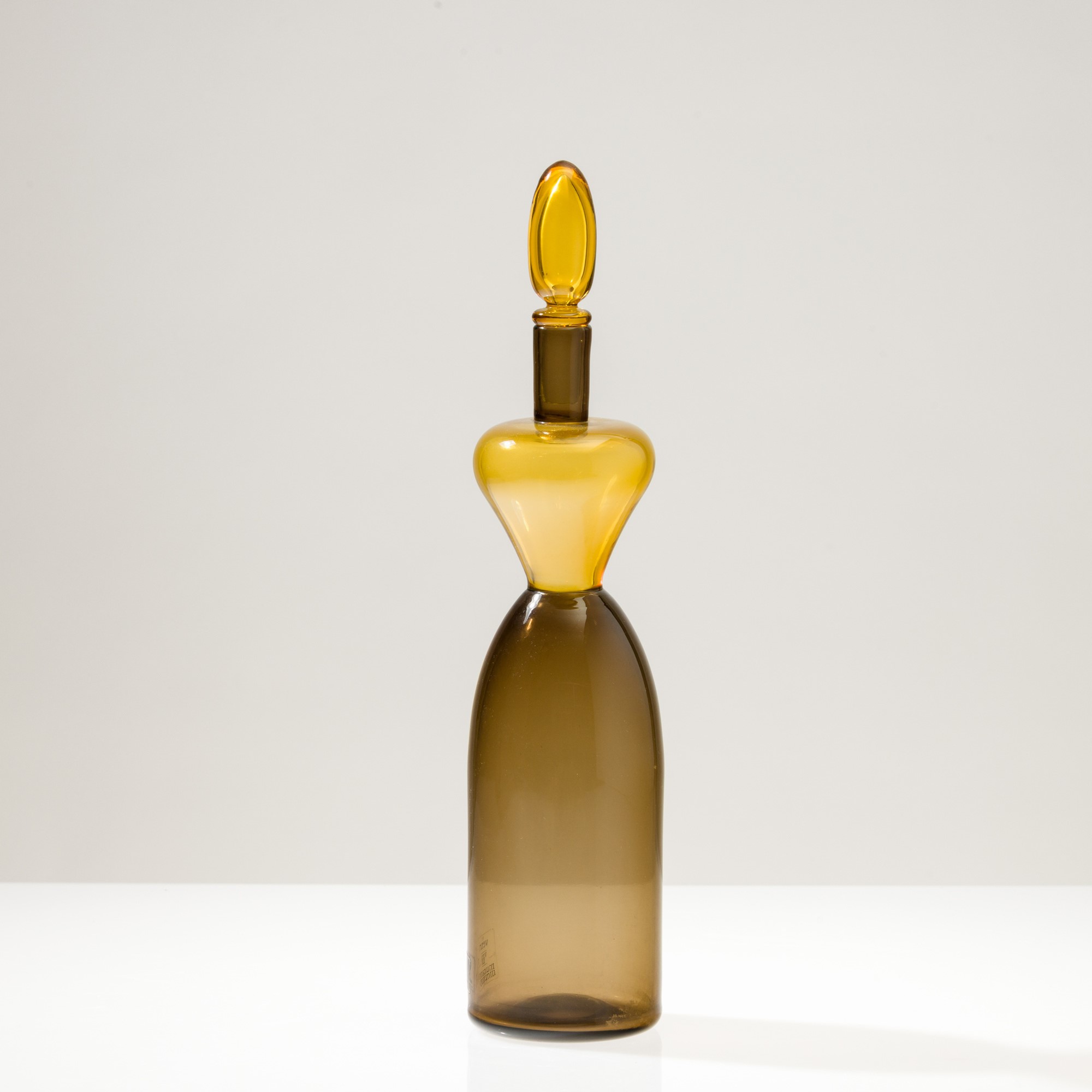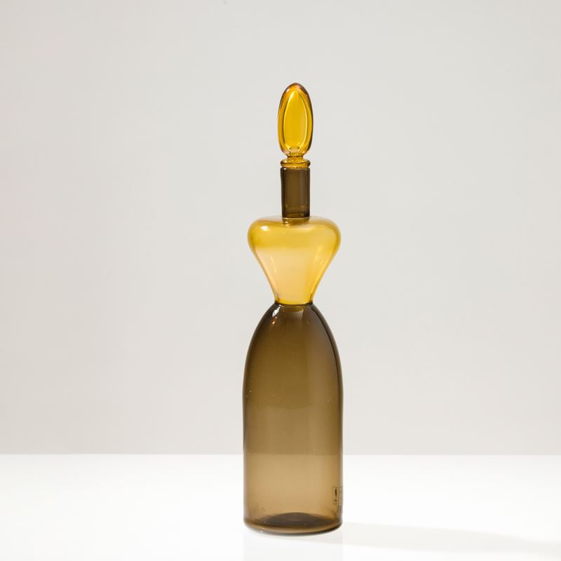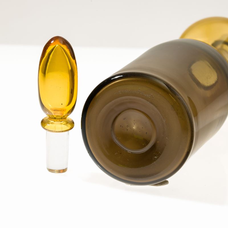 Gio Ponti bottle in blown talpa and pagliesco glass with olive-shaped stopper.