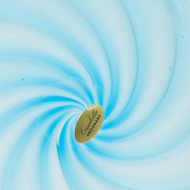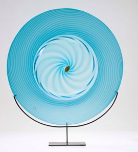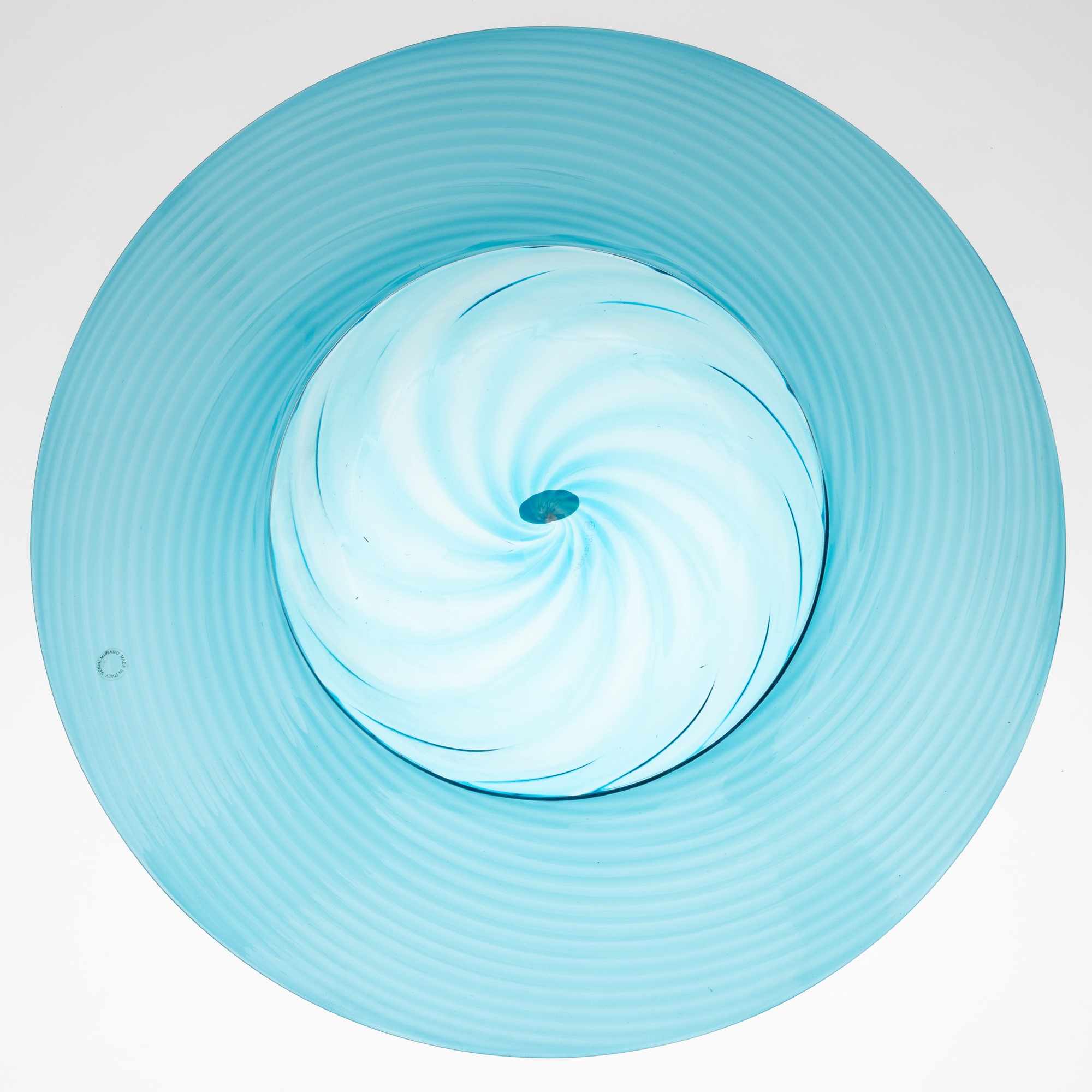 Opulus series large plate in blown acquamare and orizzonte glass with ribbing on the rim.