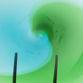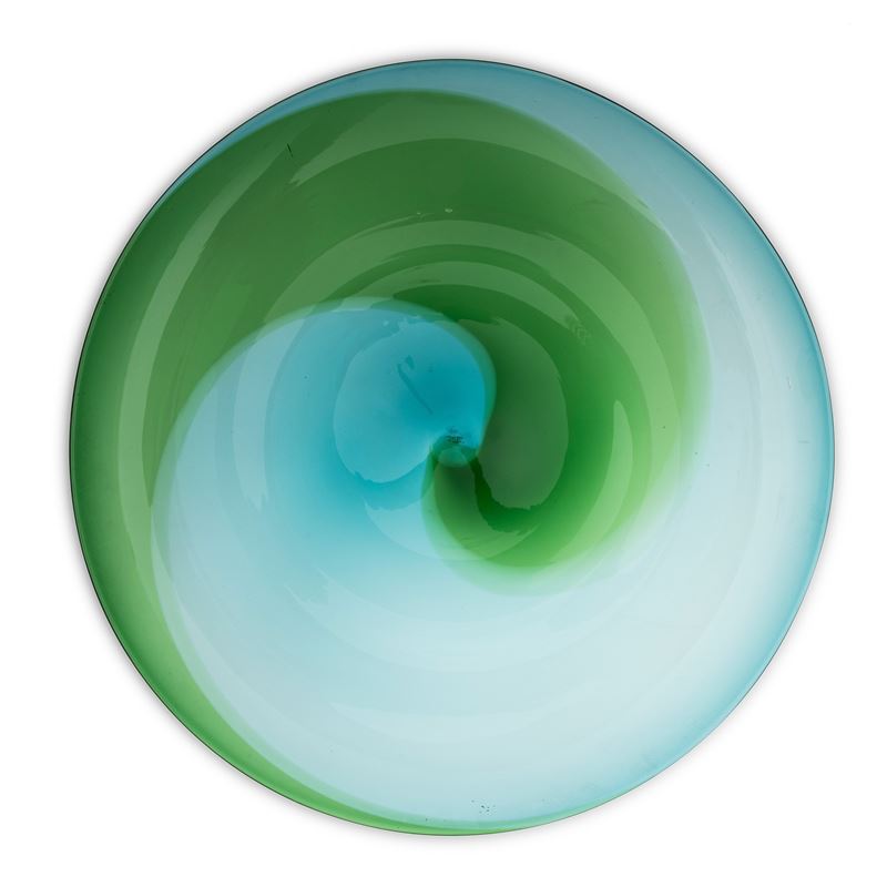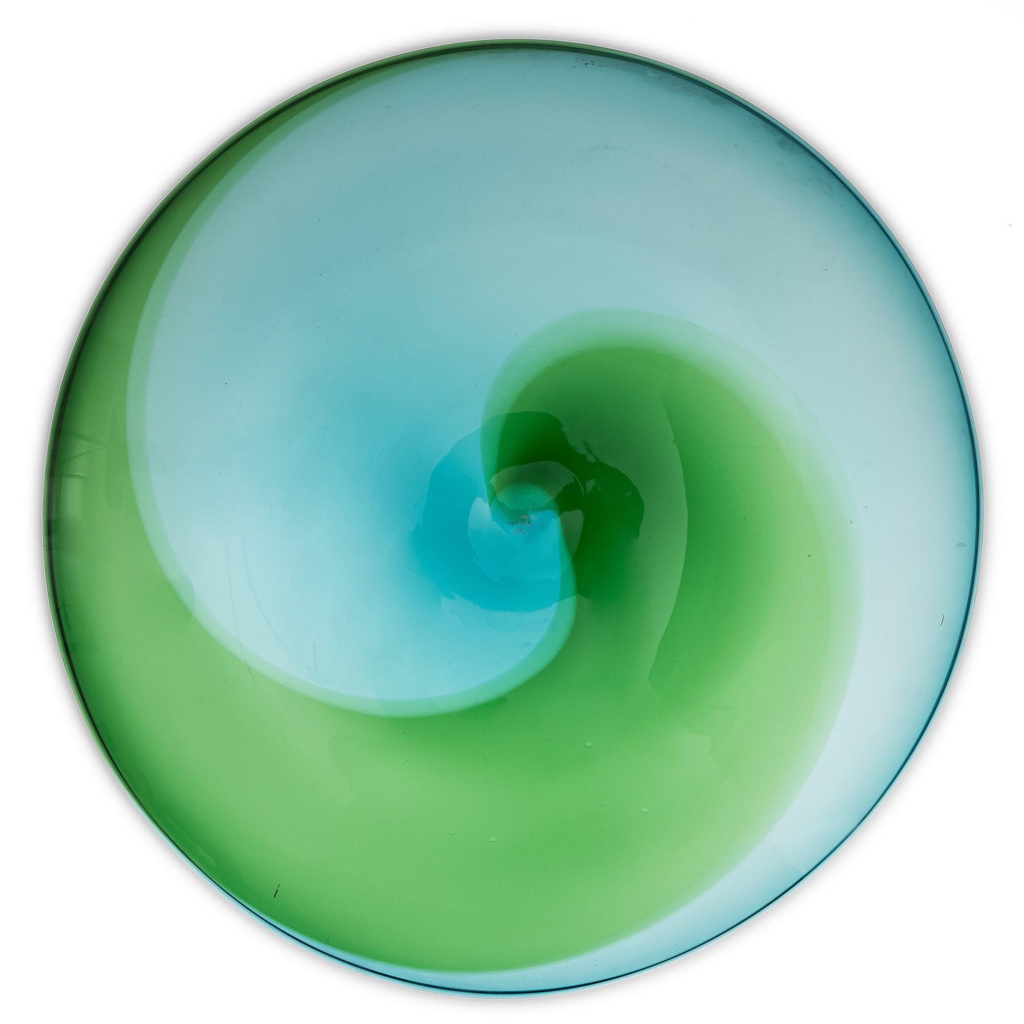 Coreani series large plate in blown glass with spiral bands decoration in Adriatico and verde mela.