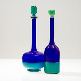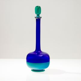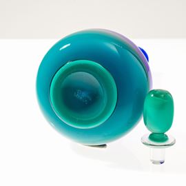 Incalmo bottle with olive-shaped stopper in blown green and sapphire glass.