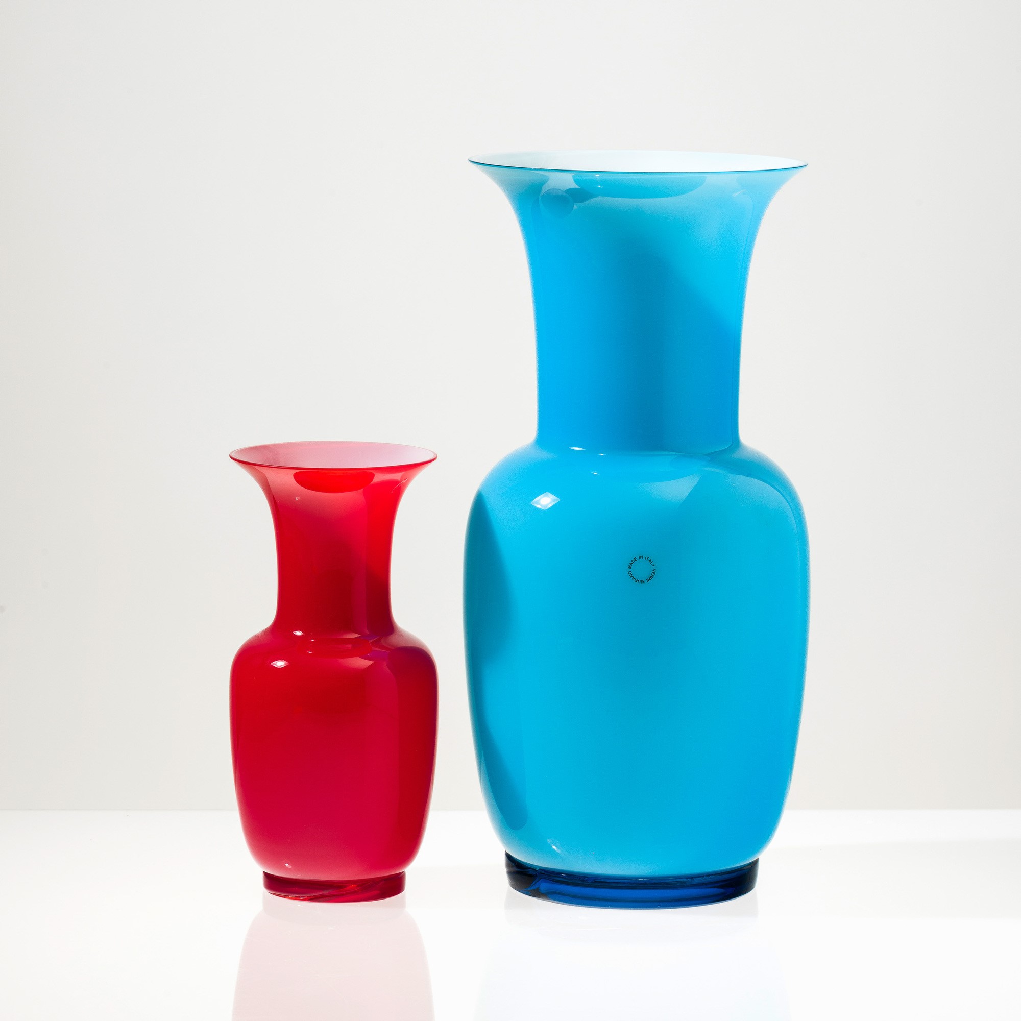 Two Opalini vases in blown acquamare and rosso glass on applied feet.