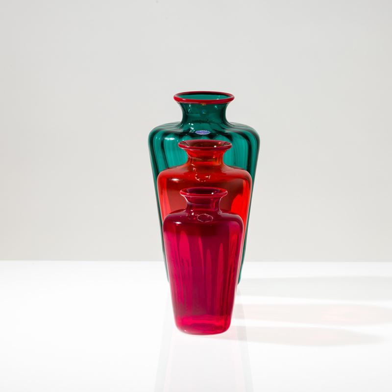 Three vases in molded blown glass with applied red glass-thread decoration.