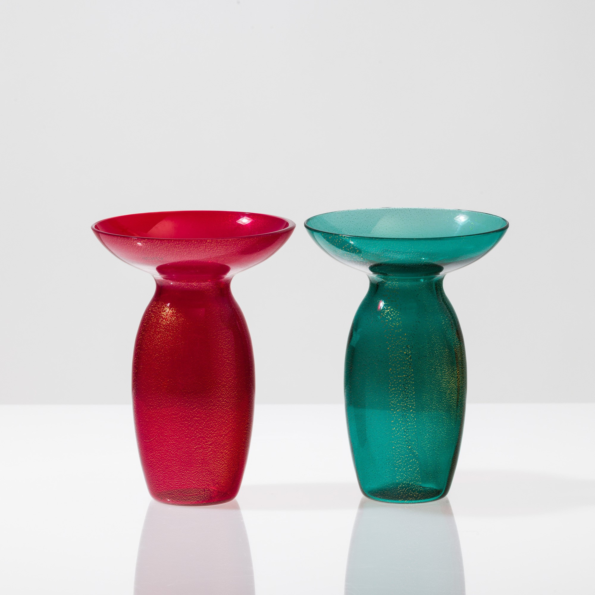 Pair of Dorai candleholder vases in blown red and green glass with gold leaf decoration. Chromed bobeches.