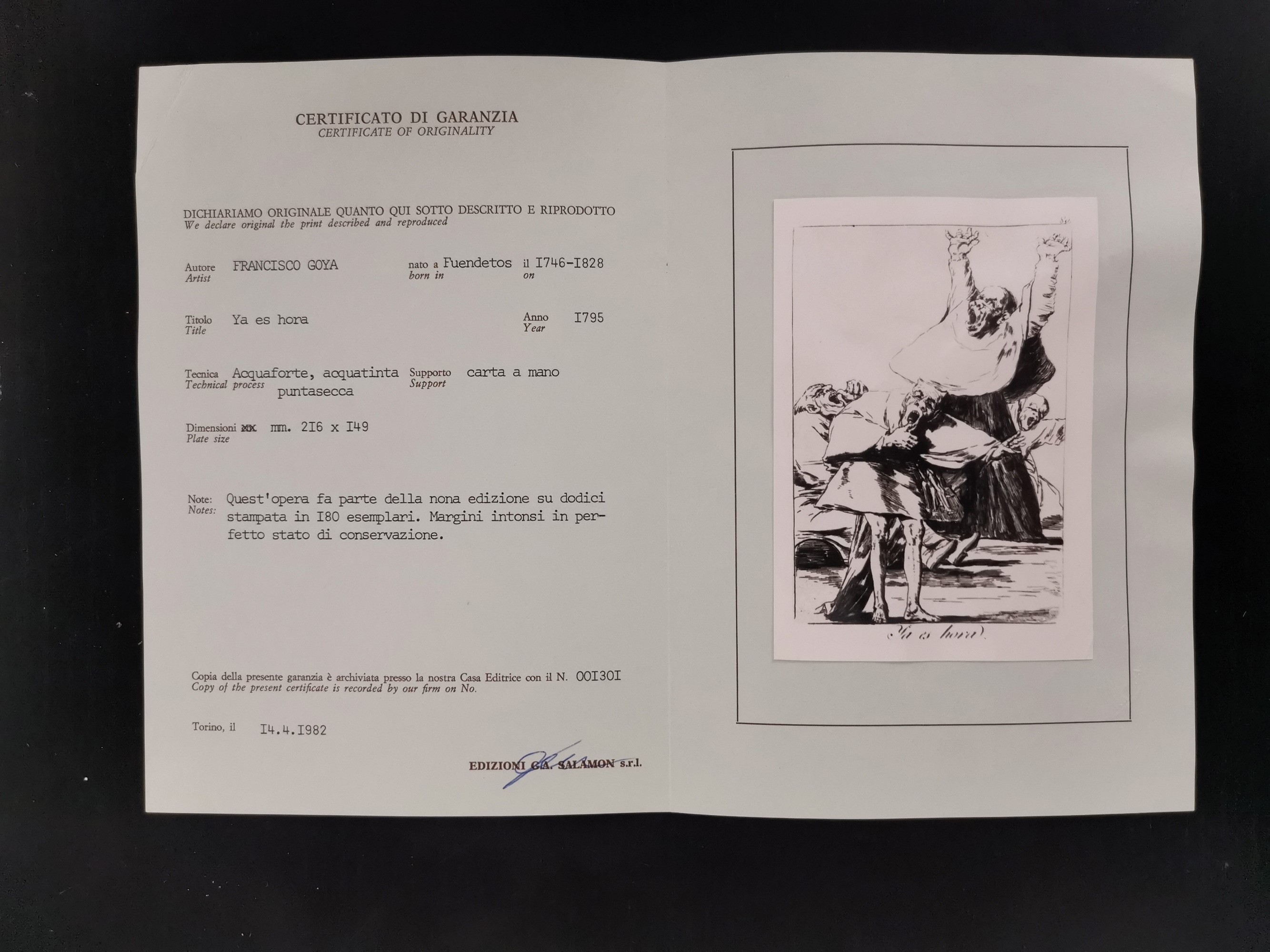 Accompagnata da certificato di garanzia di "Edizioni G.A. Salamon S.r.l." del 1982.