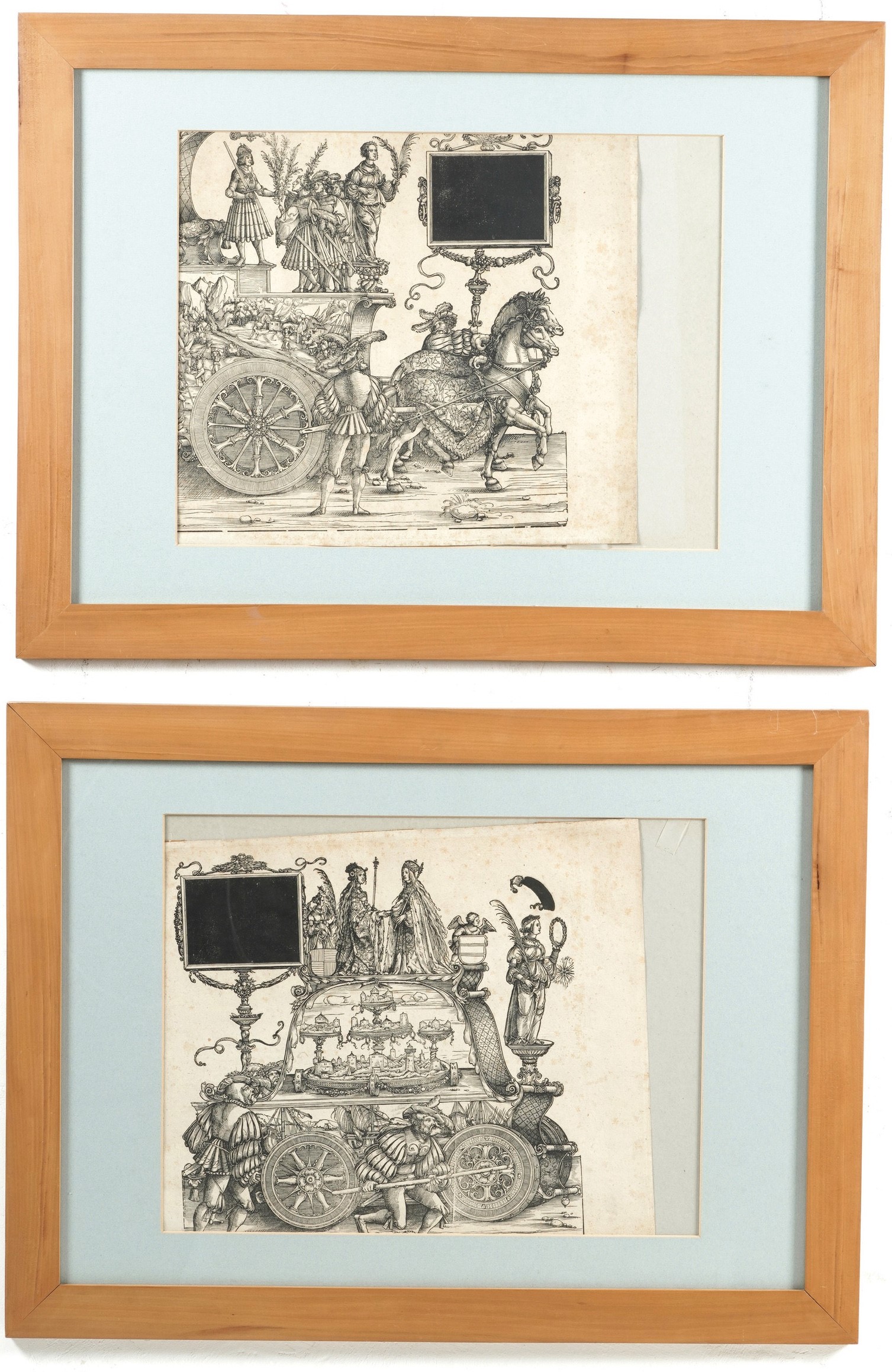 Due fogli provenienti dalla serie monumentale di incisioni xilografiche commissionata dall'imperatore Massimiliano I d'Asburgo