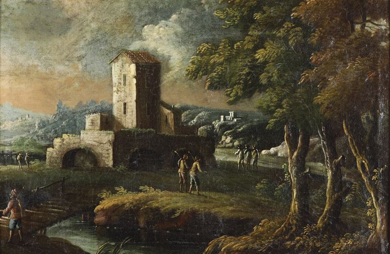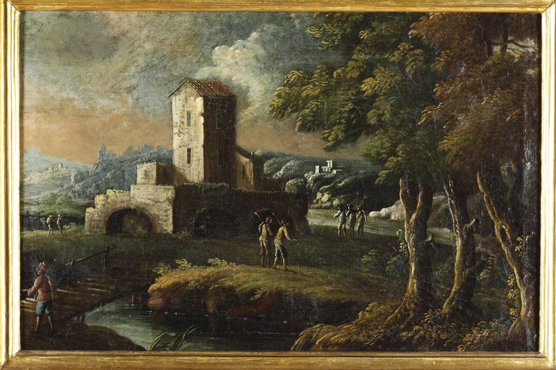 Scuola del XVIII secolo Paesaggio fluviale con contadini
