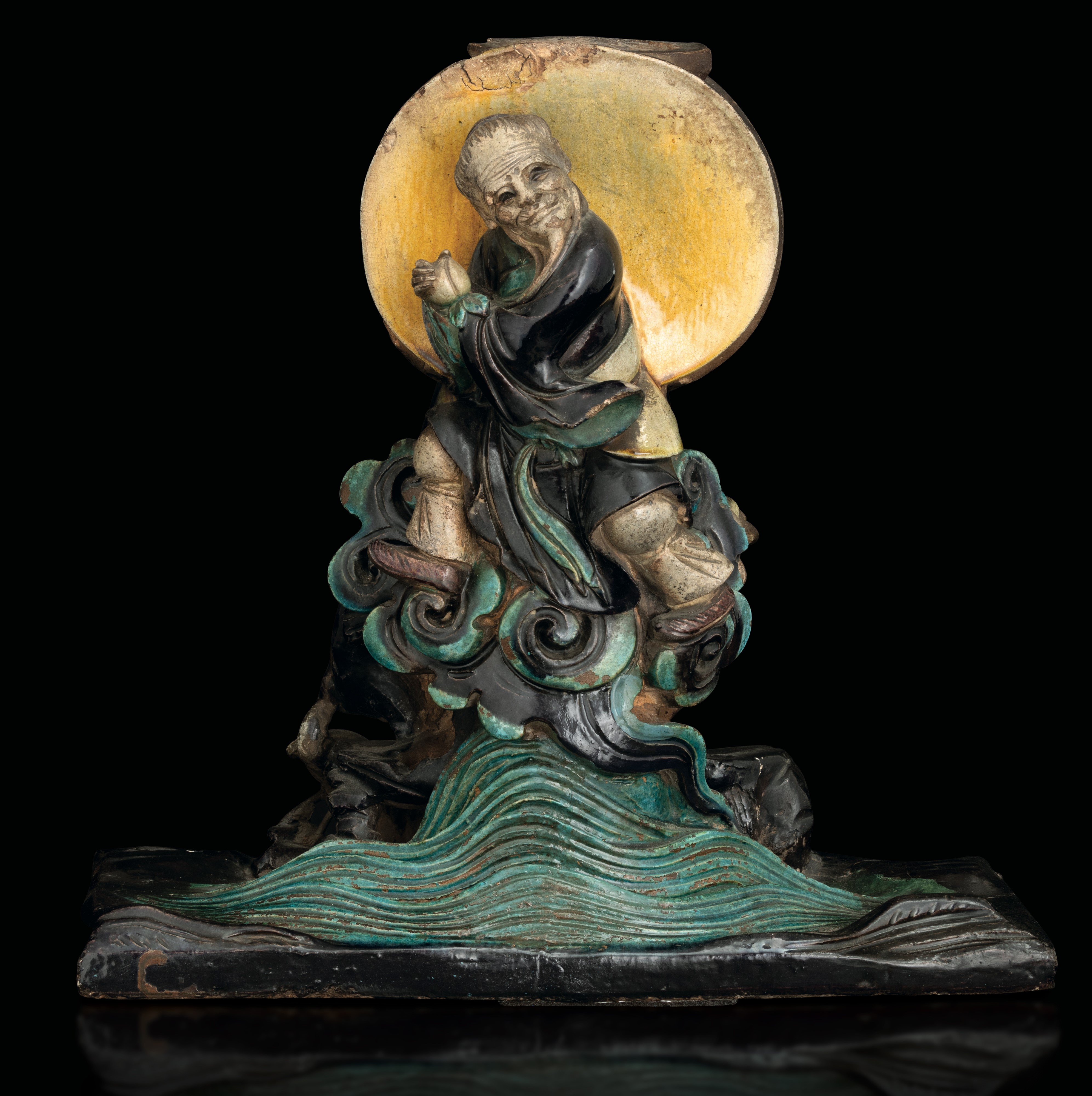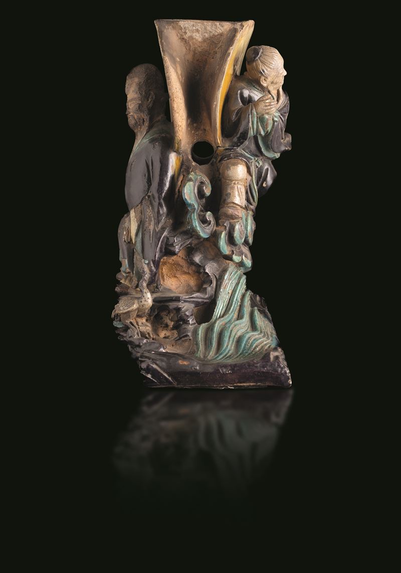 Double-sided Fahua candle holder depicting two stoneware immortals, China, Ming Dynasty, 17th century