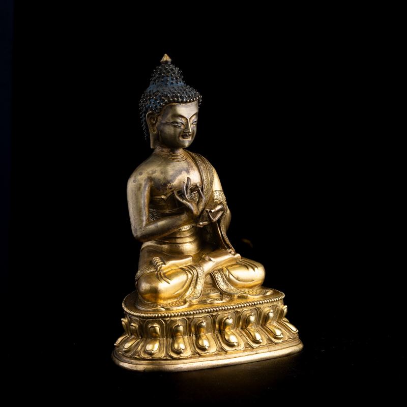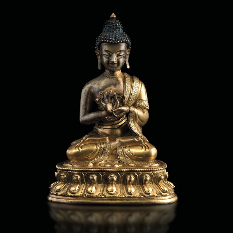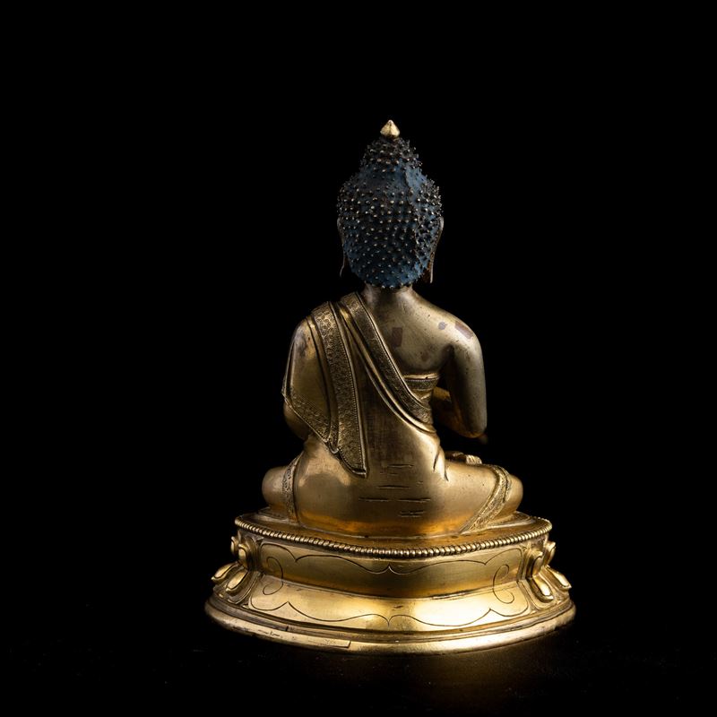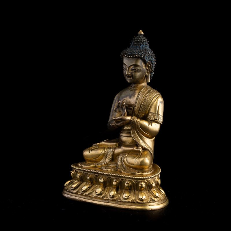 Gilt bronze Buddha figure seated on double lotus flower, Tibet, 17th century