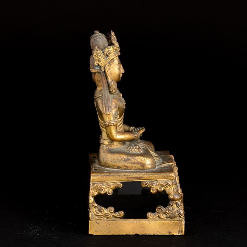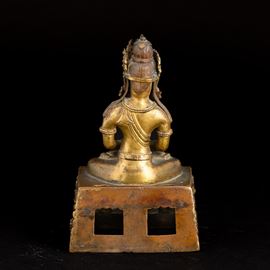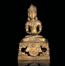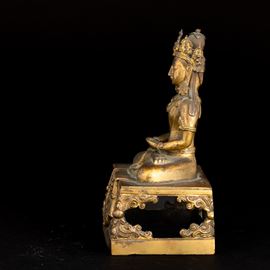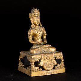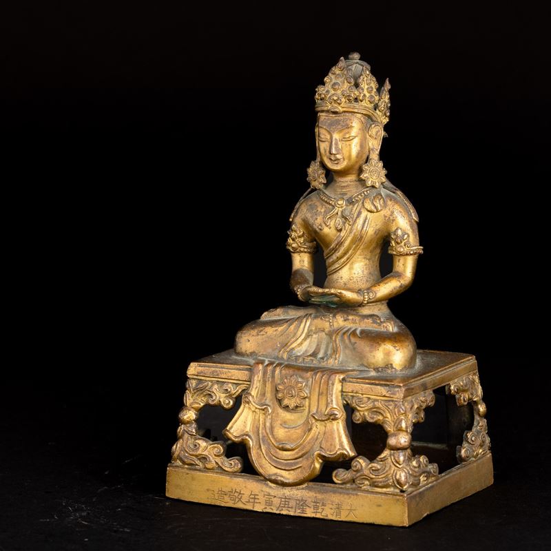 Gilt bronze figure depicting crowned Buddha Amitayus with inscriptions, “da qing qian long geng yin nian jing zao, The 55th [..]