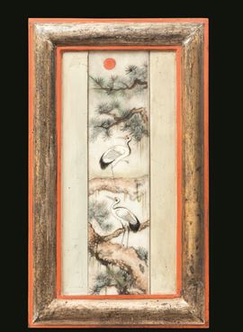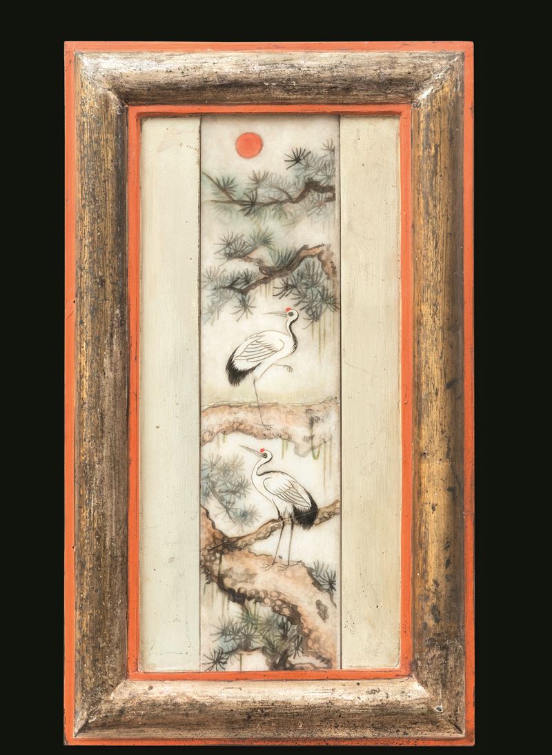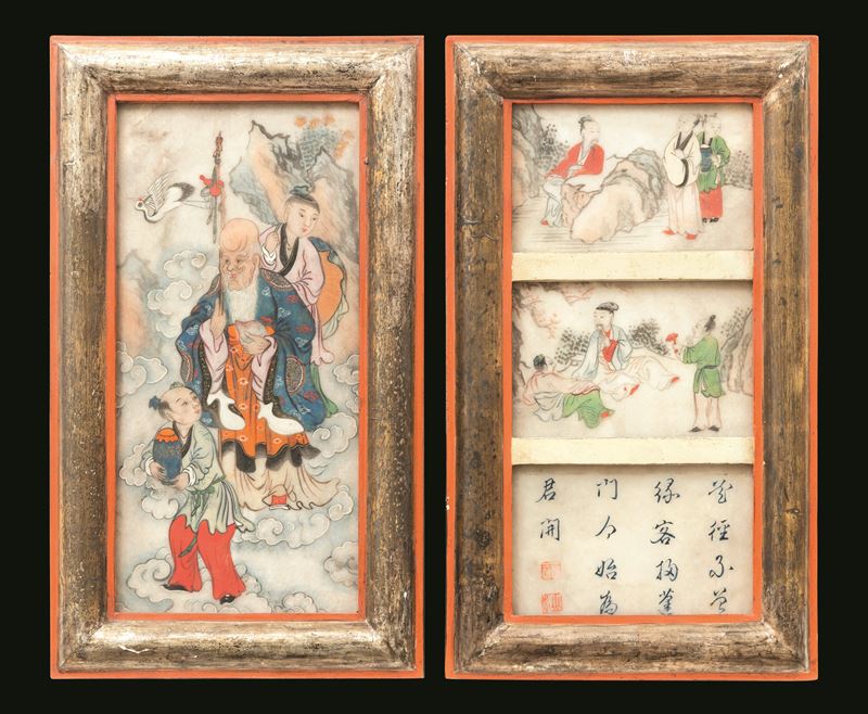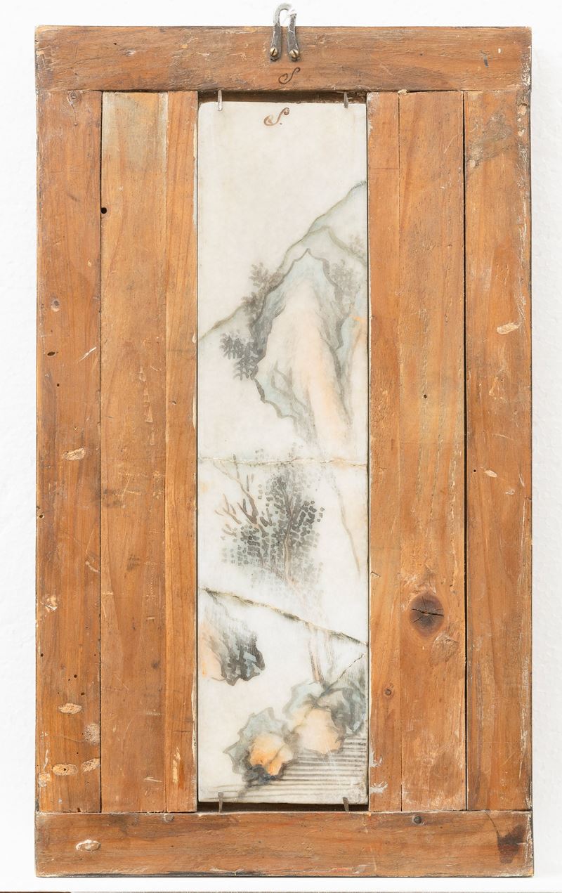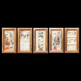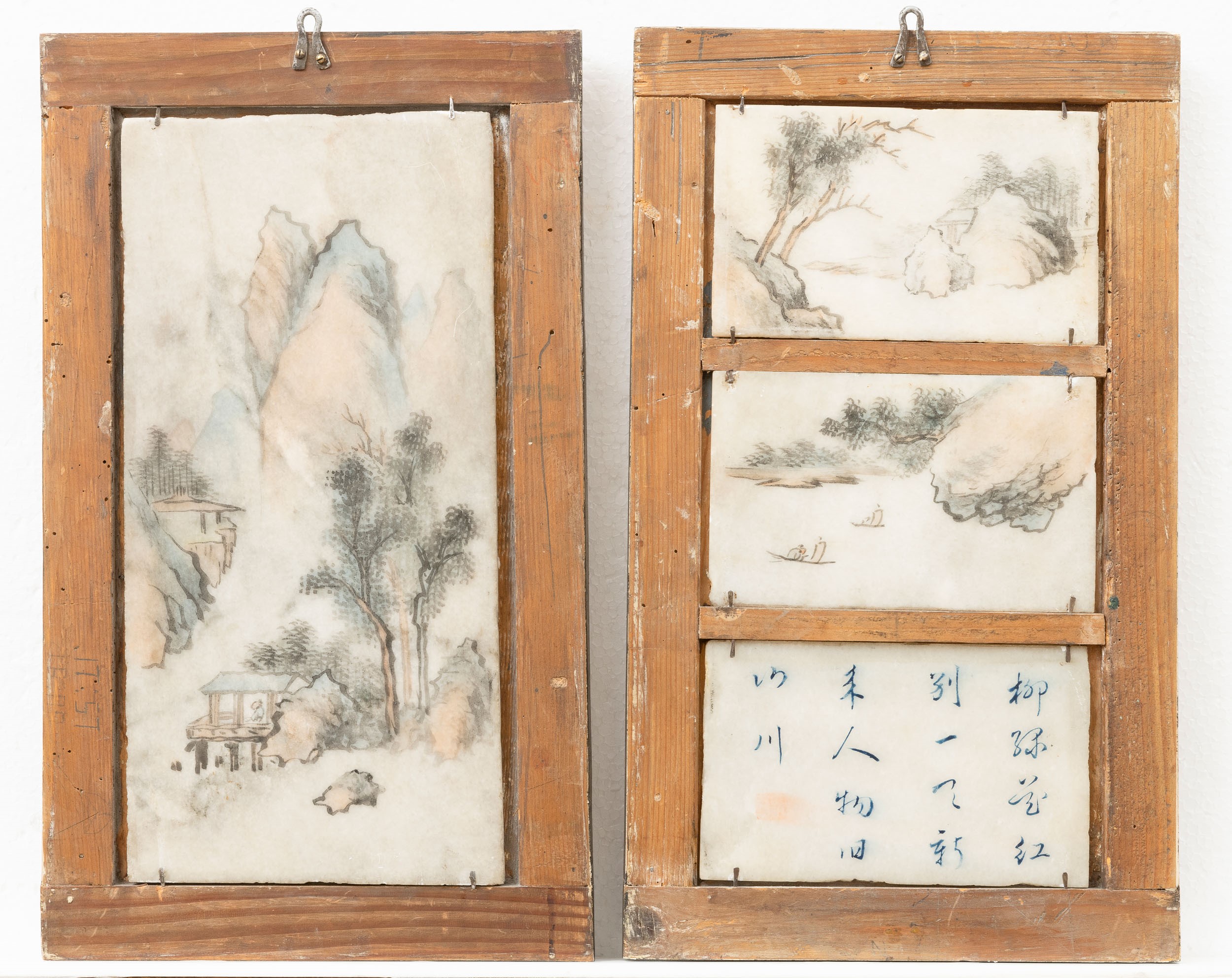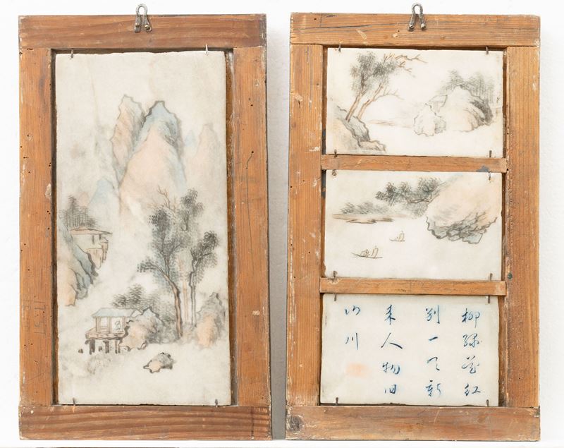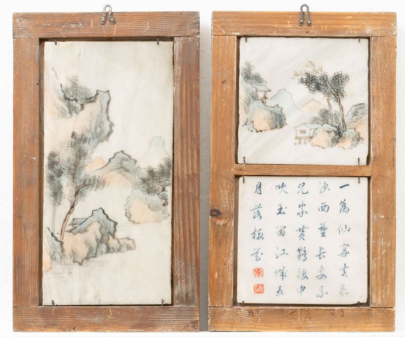 Lot composed of five painted marble plaques depicting characters, landscapes and inscriptions, China, Qing Dynasty, 19th century