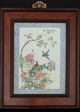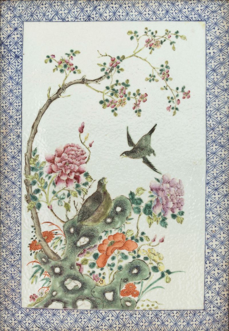 Painted porcelain plaque depicting landscape with birds, with frame, China, Qing Dynasty, end of 19th century beginning [..]