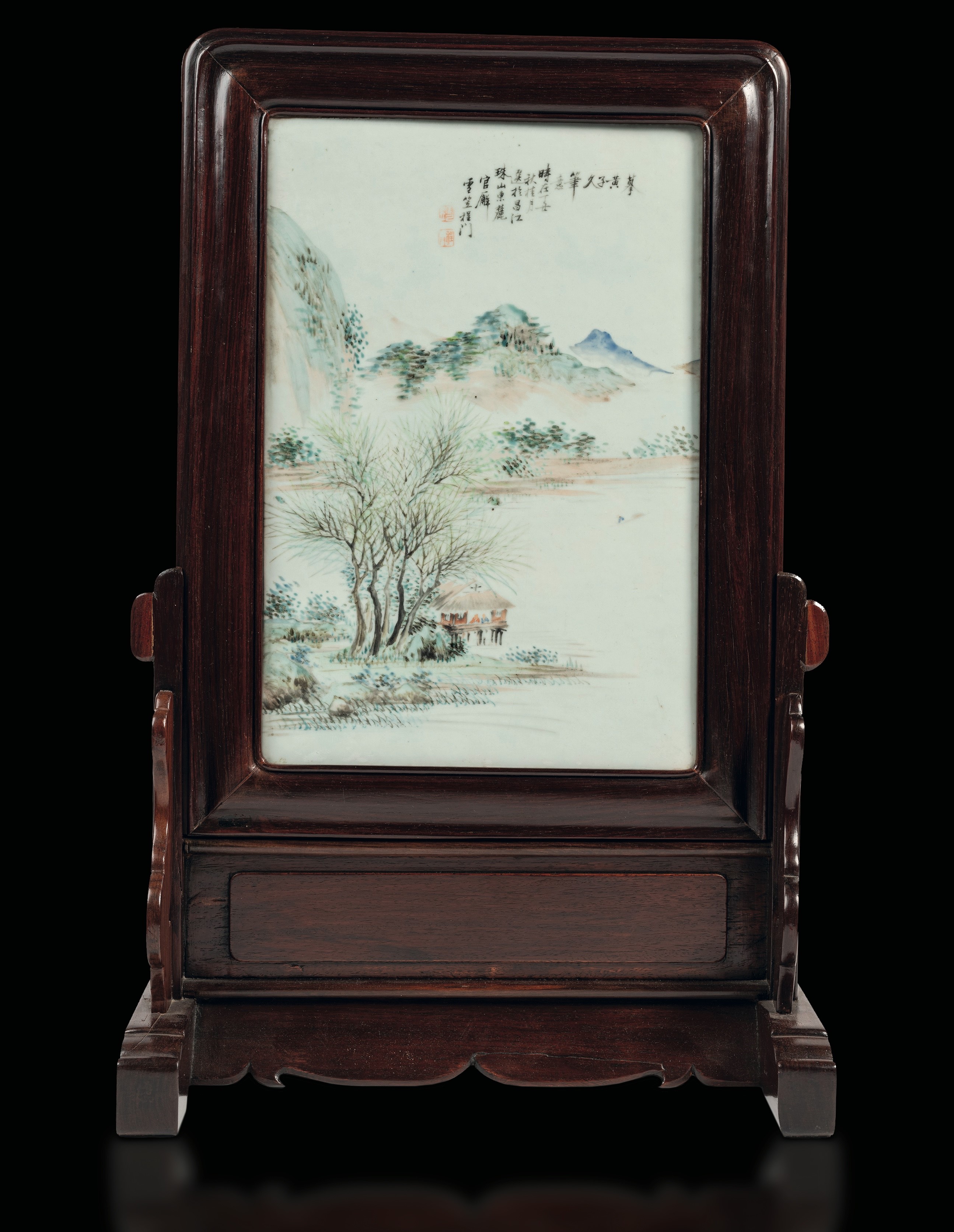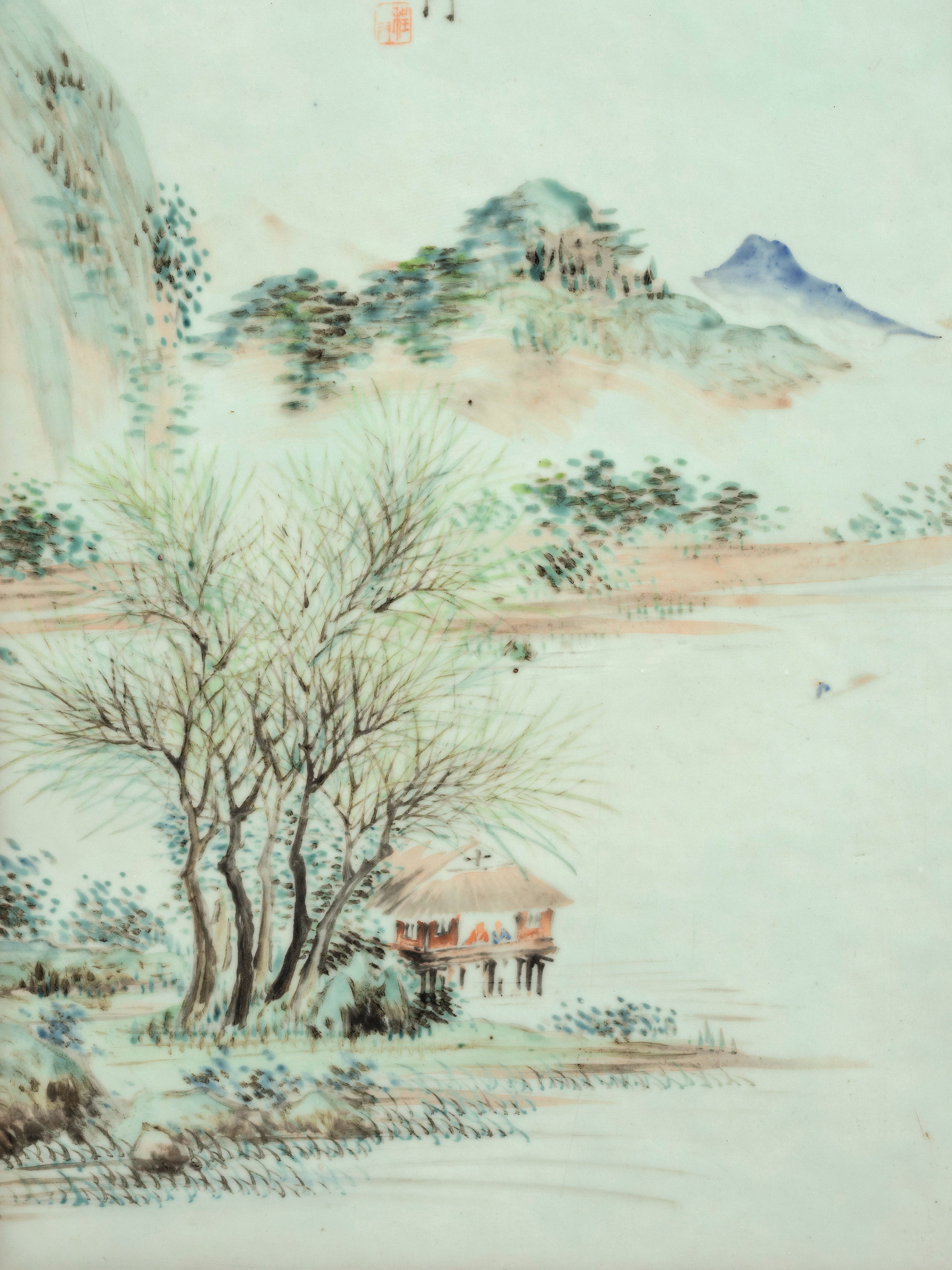 Placca in porcellana Qianjiangcai firmata Cheng Men a soggetto paesaggistico, Cina, Dinastia Qing, epoca Guangxu, 1877