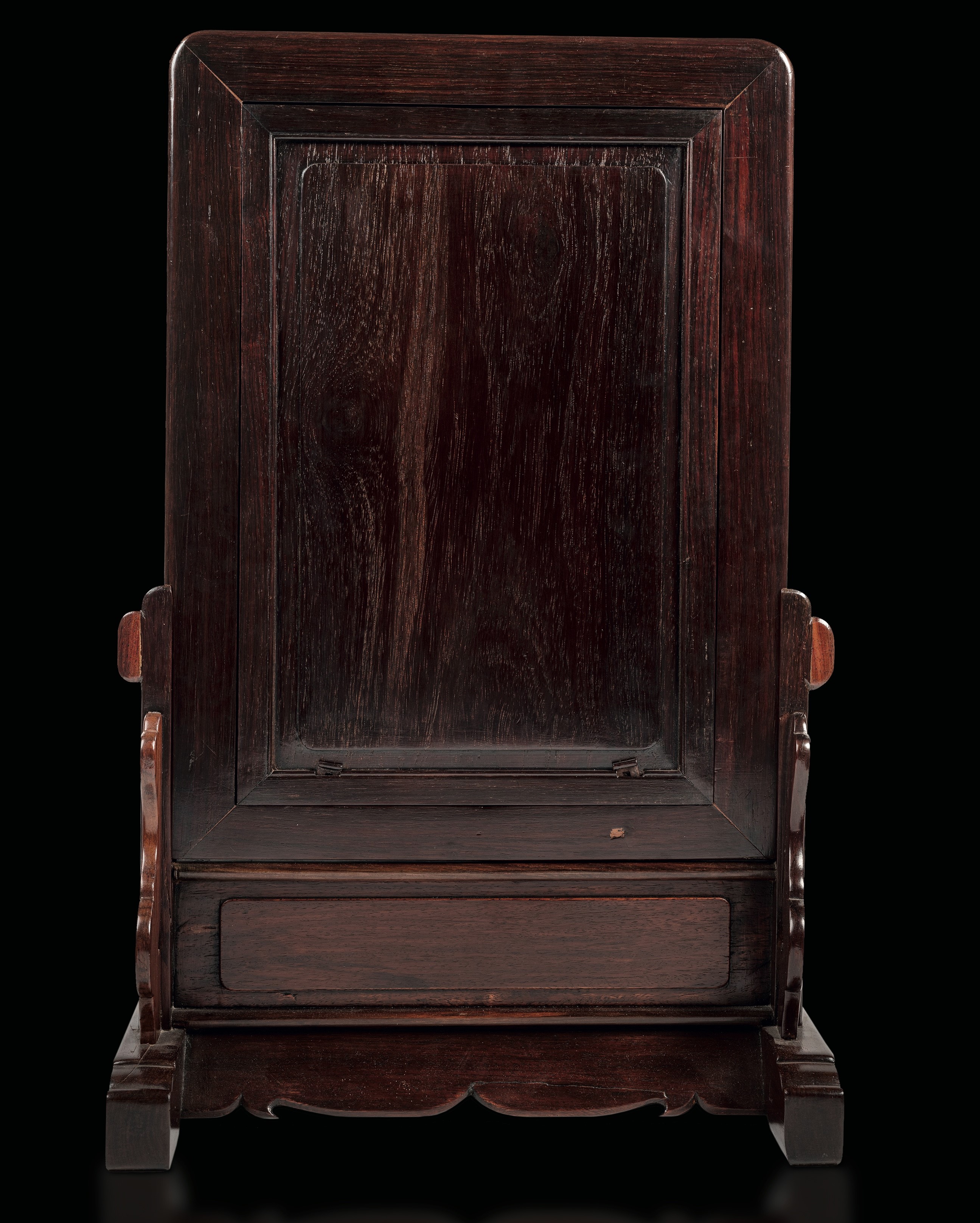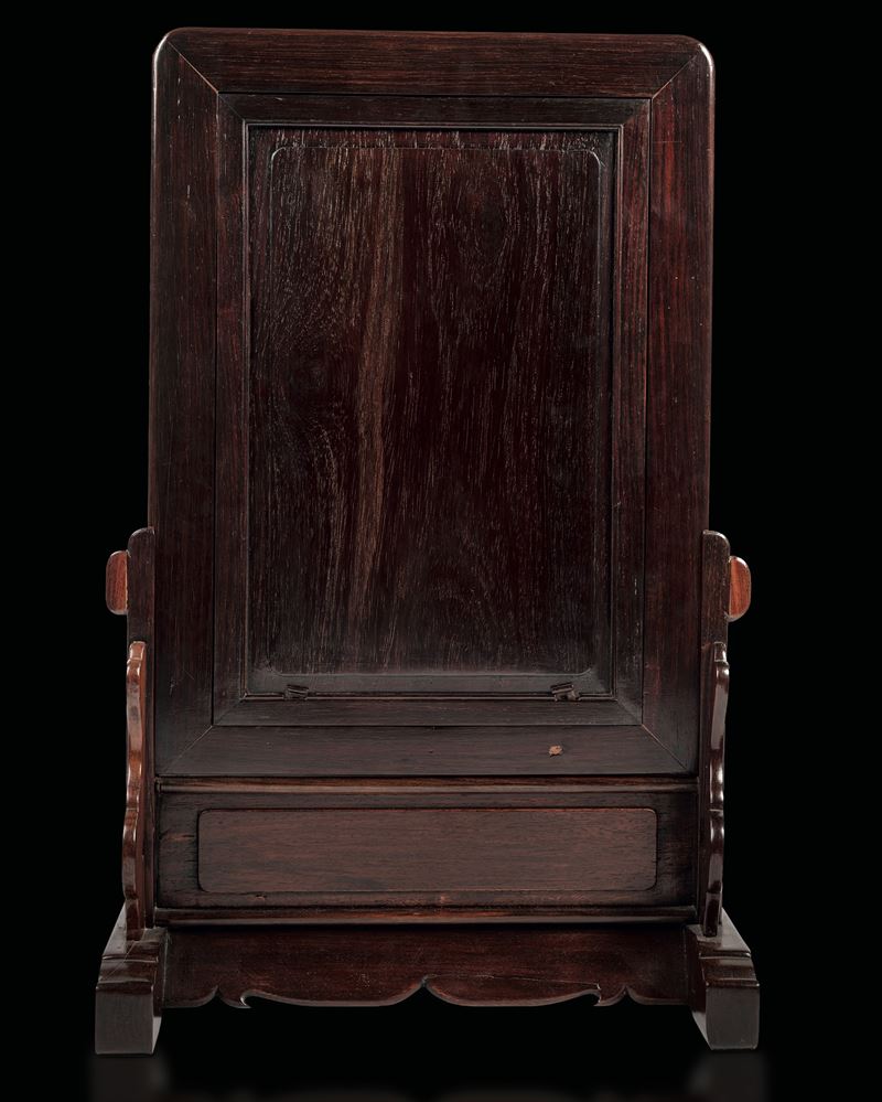 Eseguiva uno stile libero e audace, utilizzando tecniche di pennellata secca e inchiostro diluito con tratti di contorno e ombreggiature che ricordano da vicino la pittura letterata. Questa pittura su placca di porcellana è una fedele interpretazione della tecnica di pennello del maestro Yuan Huang Gongwang, uno dei "Quattro Grandi Maestri della Dinastia Yuan". La composizione è semplice ma elegante, emettendo sia fluidità che fascino