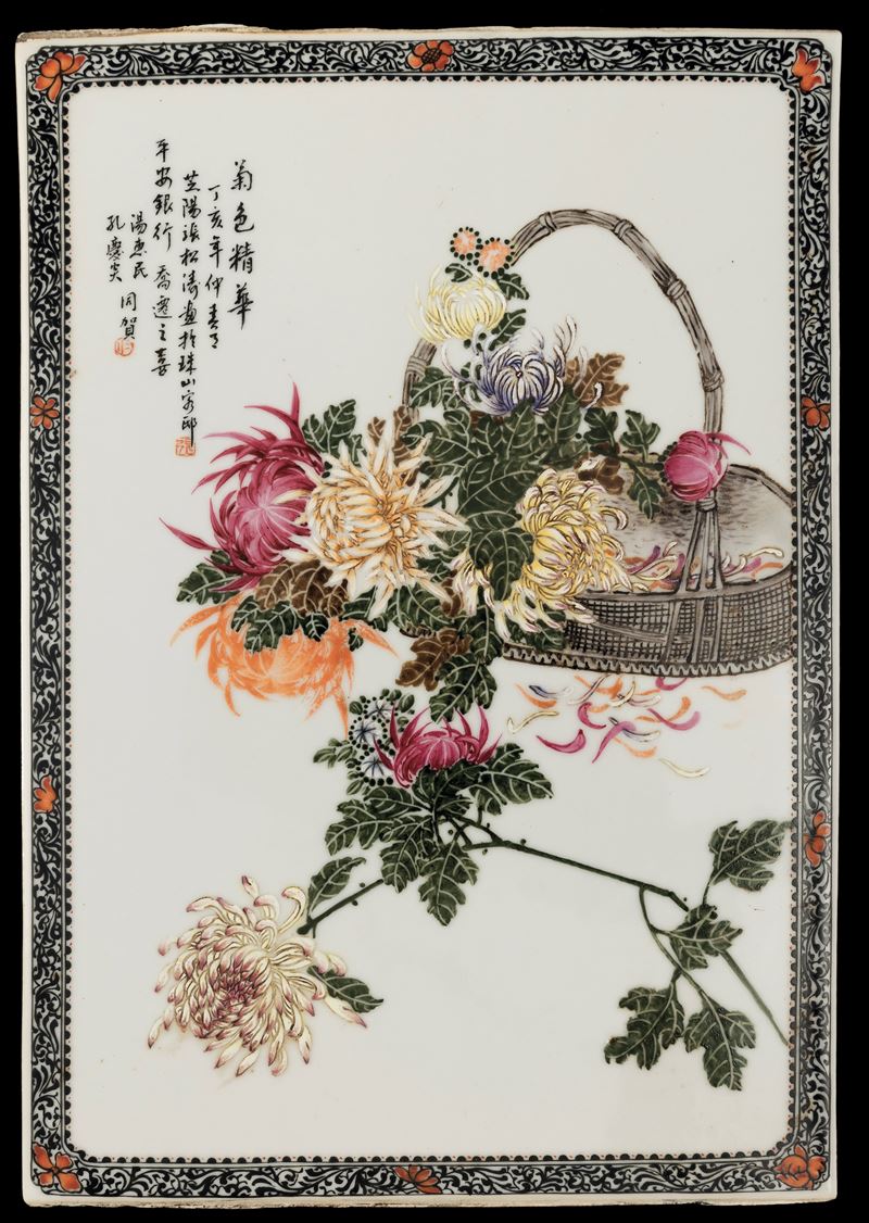 Porcelain plaque depicting flowers with inscriptions “In the summer of Dinghai year, Ping An bank celebrates the joy of relocation, 1907,” China, 20th century